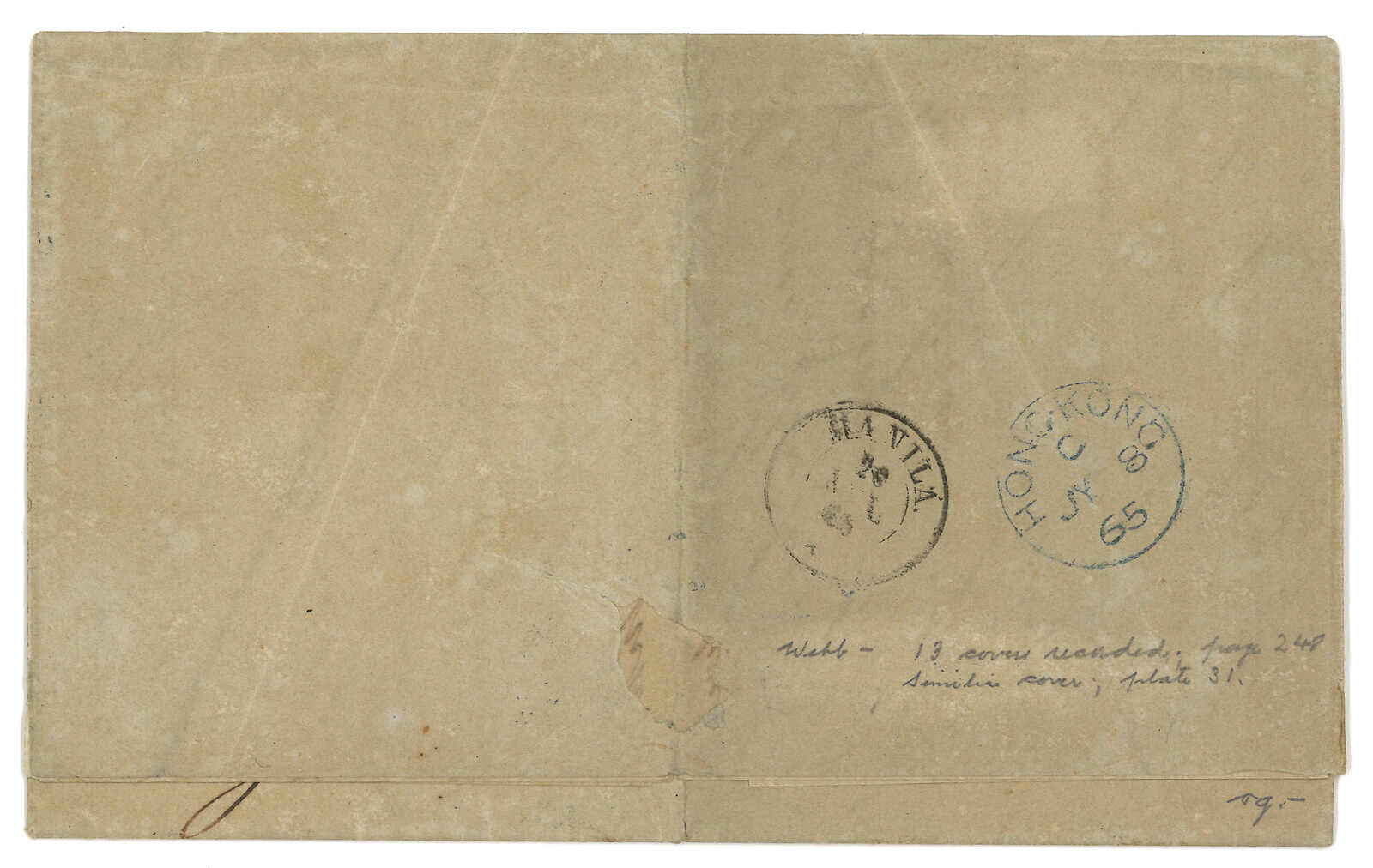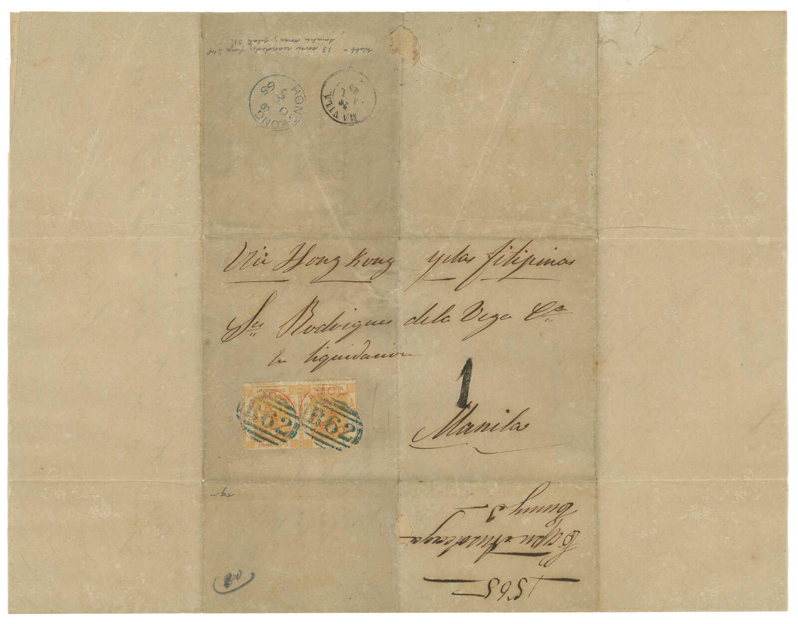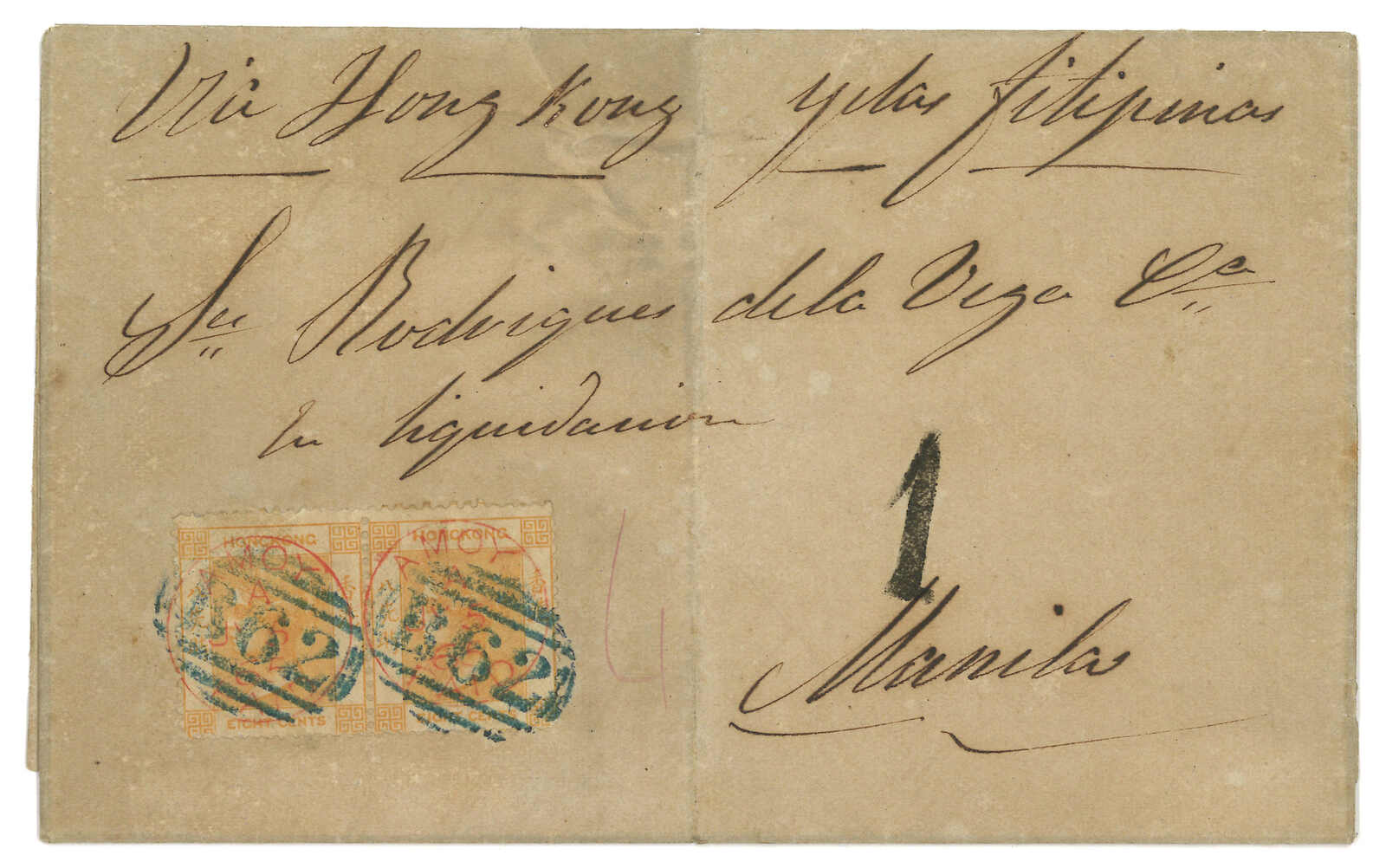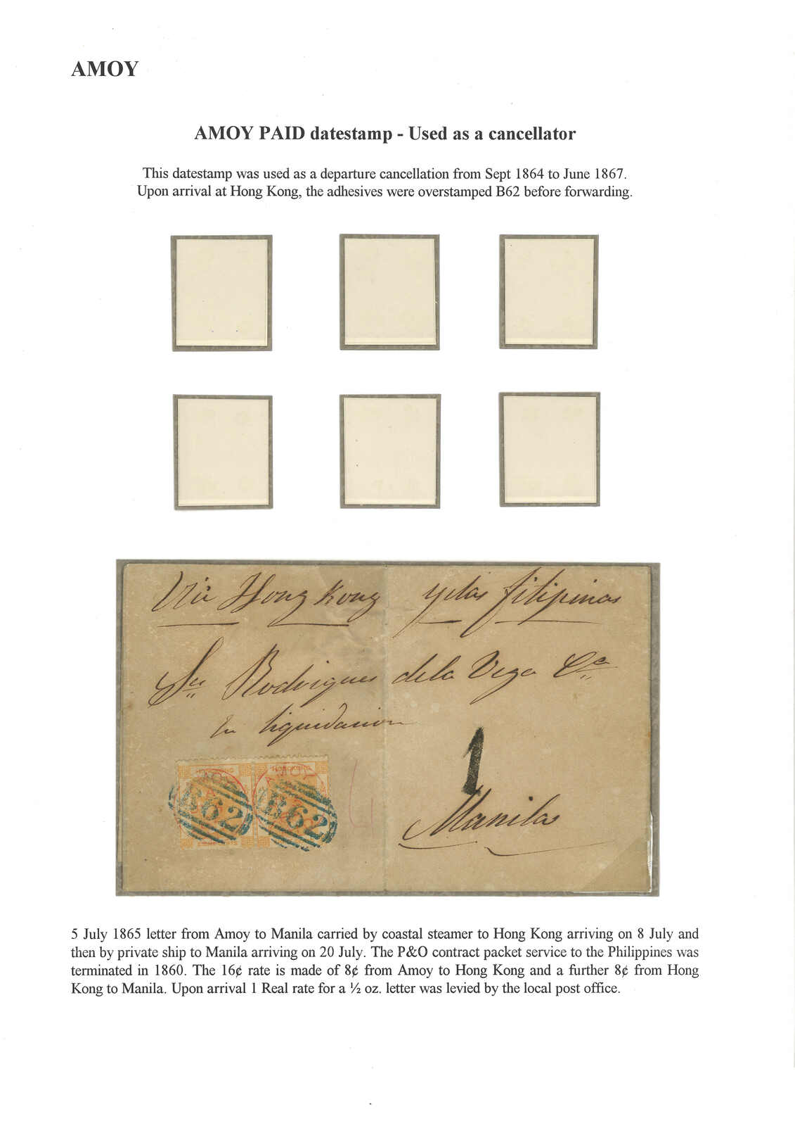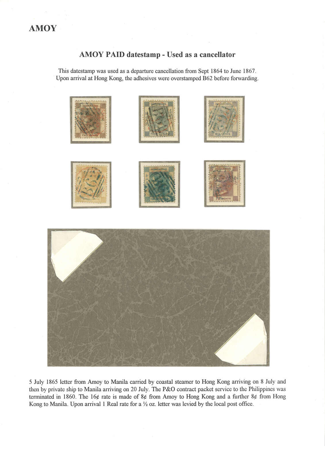 1865.7.5 廈門寄馬尼拉。郵簡,貼香港維多利亞女皇像8仙雙連,銷廈門英局Webb A型“AMOY PAID”日戳。7.8經香港,貼票再銷B62殺手戳。抵馬尼拉後需再付1里爾本地郵資。Webb記錄中,蓋有此戳之貼票封僅有十三件,Pearson記錄則十六件。 2025年7月艾華夏拍中,一件1865年10月26日自廈門寄美國之貼票封,蓋有相同A型日戳及B62殺手戳,以港幣4萬2千元落鎚(拍品號2914)。(Image 1)
