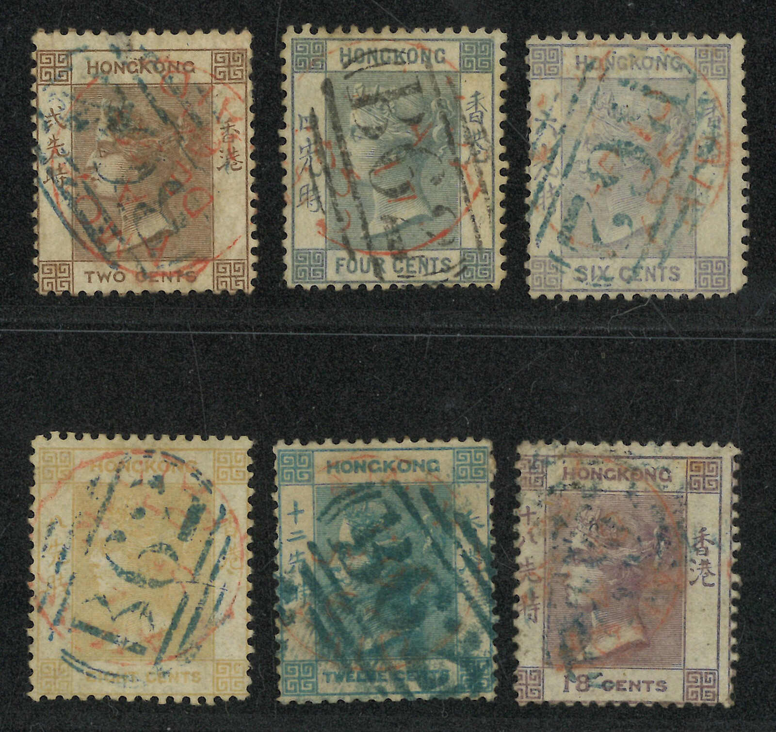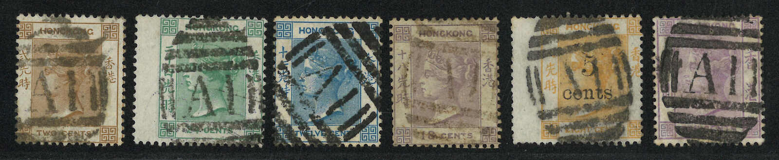 A group of 6 Hong Kong QV used stamps, all tied by A1 obliterator in black.