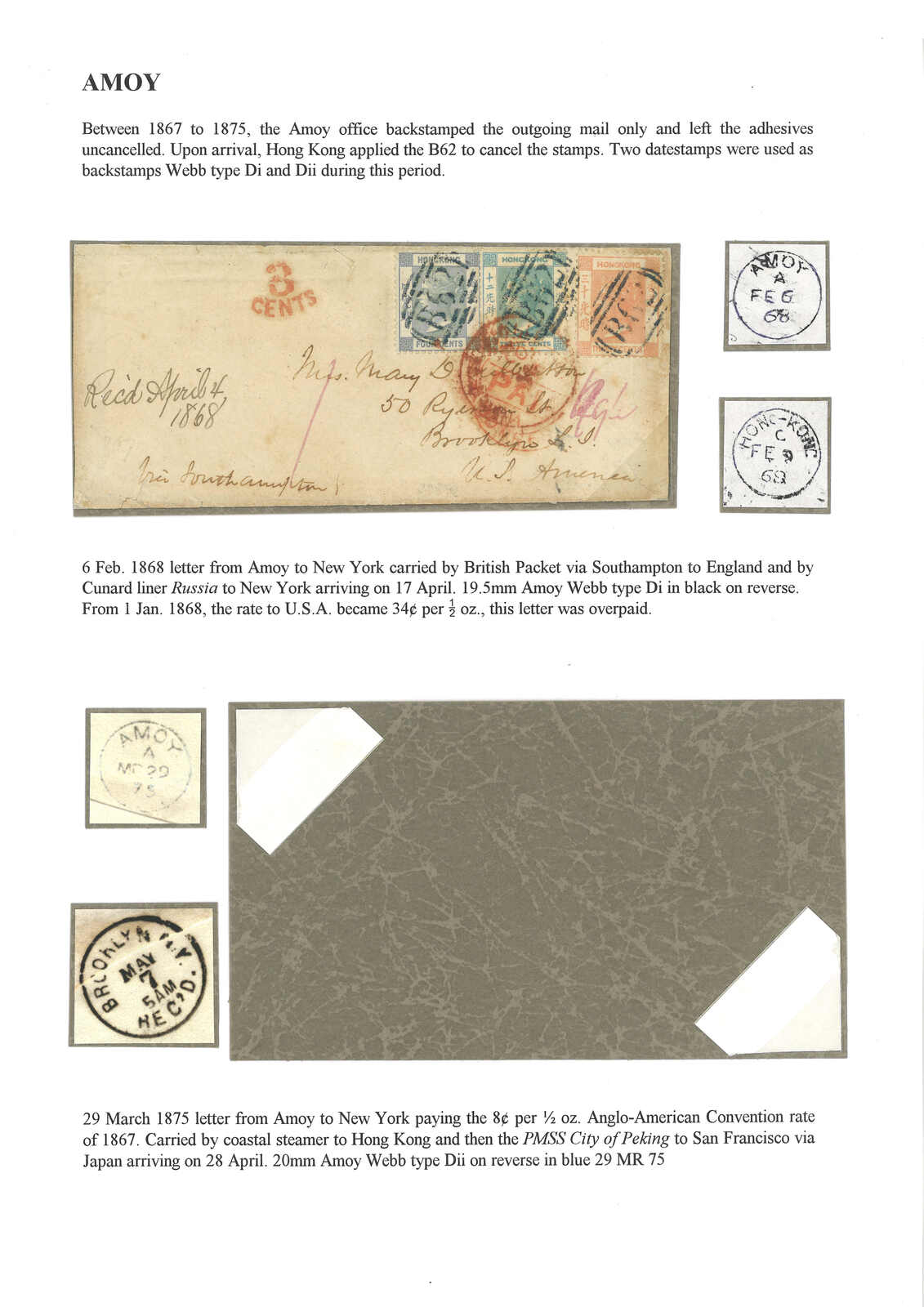 1868 Amoy (6 Feb) to USA, applied with Amoy BPO type Di cds on reverse. On front f.w. Hong Kong QV 4c + 12c + 30c, tied by B62 obliterator, matching with Hong Kong (9 Feb) transit cds. Transit London and applied with "3CENTS"