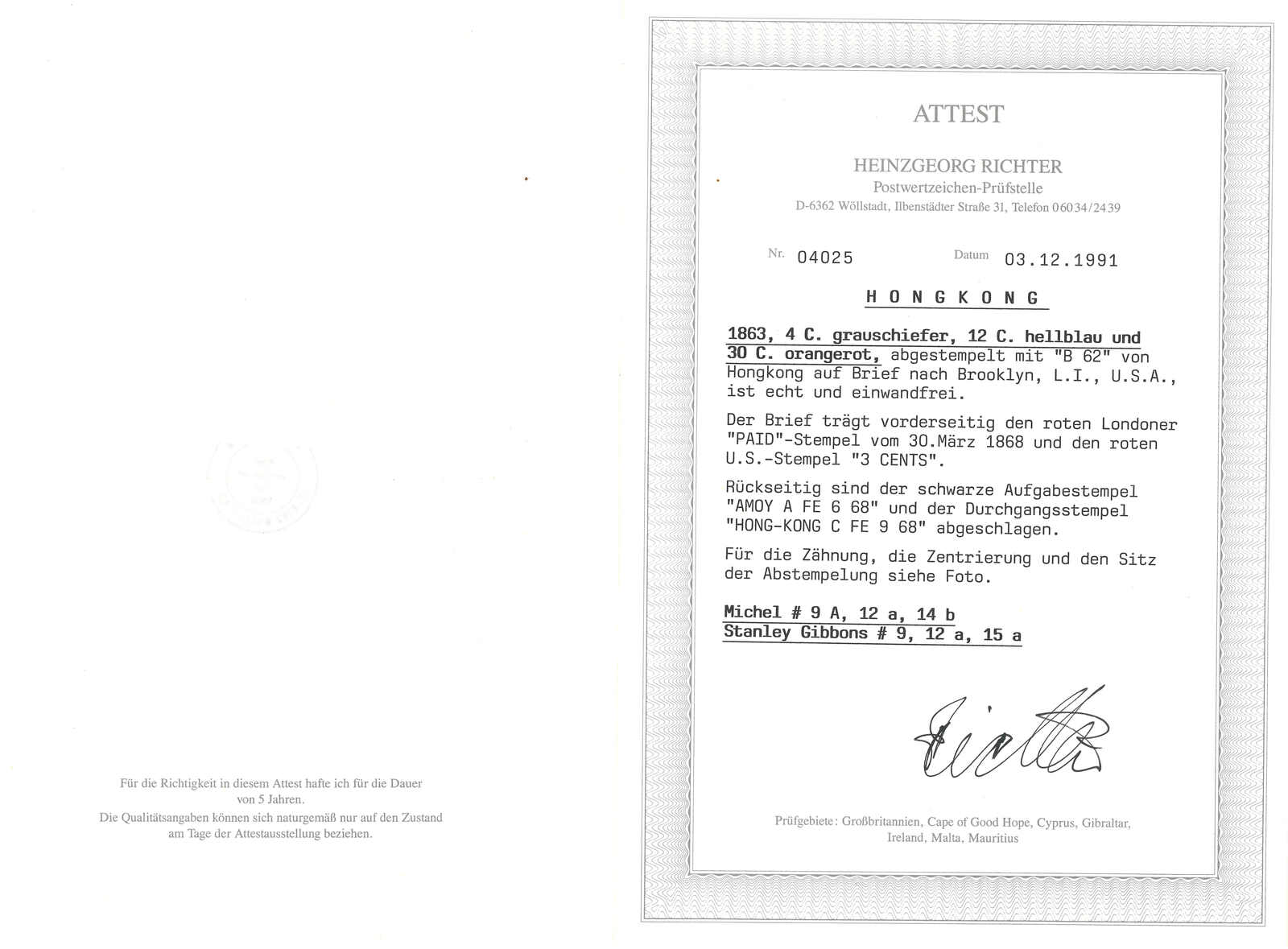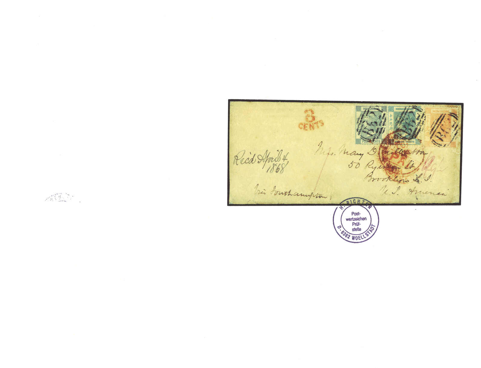 1868.2.6 廈門寄美國,背面鈐廈門英局Di型日戳。正貼香港維多利亞女皇像4仙 + 12仙,銷B62殺手戳,另見香港2.9中轉戳。再經倫敦,鈐“3CENTS”戳記付跨大西洋郵資。正確郵資為34仙,故為溢貼。附證書。(Image 1)