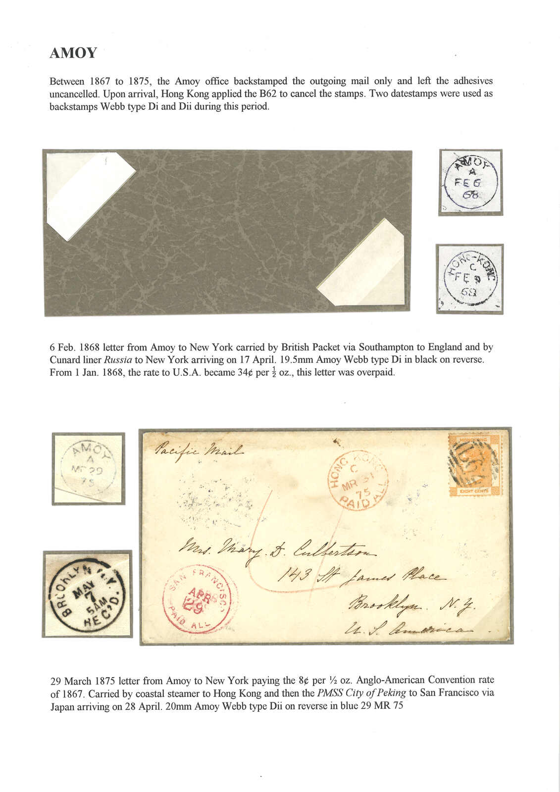 1875.3.29 廈門寄美國,背面鈐廈門英局Dii型藍色日戳。正貼香港維多利亞女皇像8仙,銷B62殺手戳,旁鈐香港PAID ALL日戳。4.29經三藩市。1867年英美郵政協議郵資例子。此封Dii型日戳之日期比Webb記錄(1875年2月15日)更晚。(Image 1)