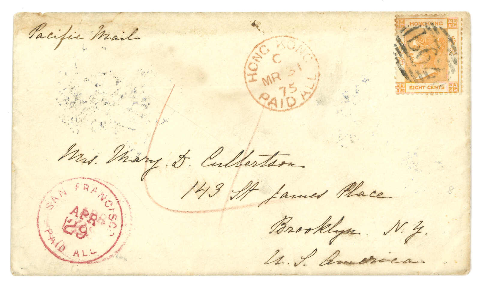 1875 Amoy (29 Mar) to USA, applied with Amoy BPO type Dii cds in blue on reverse. On front f.w. Hong Kong QV 8c, tied by B62 obliterator with Hong Kong Paid All cds. Transit San Francisco (29 Apr). Example of 1867