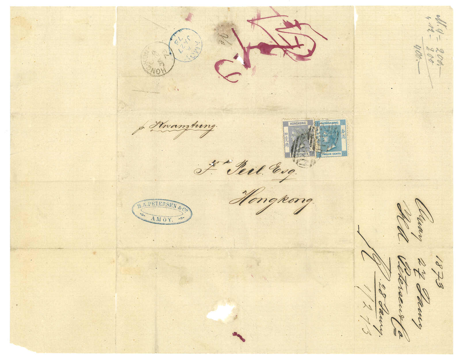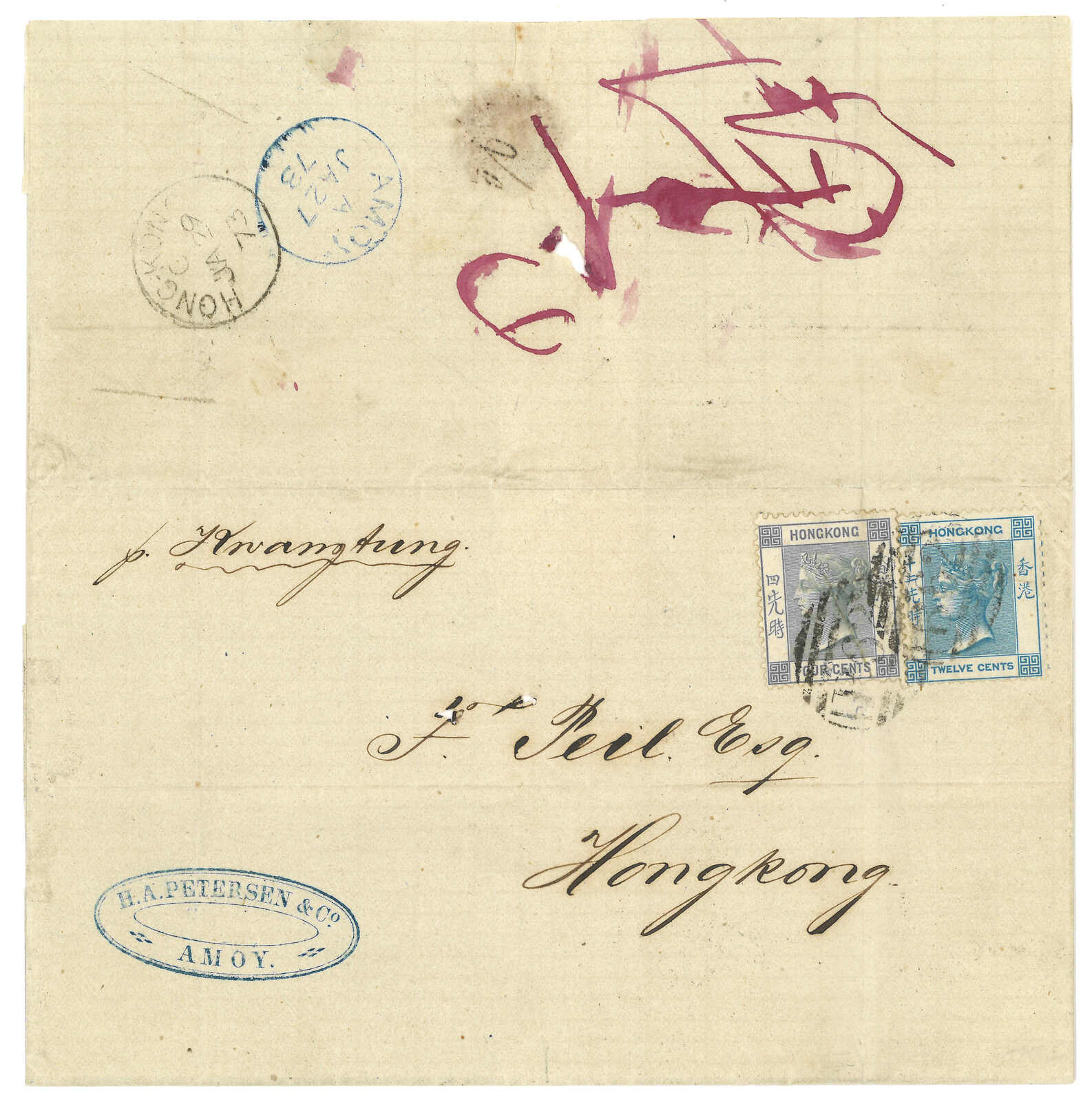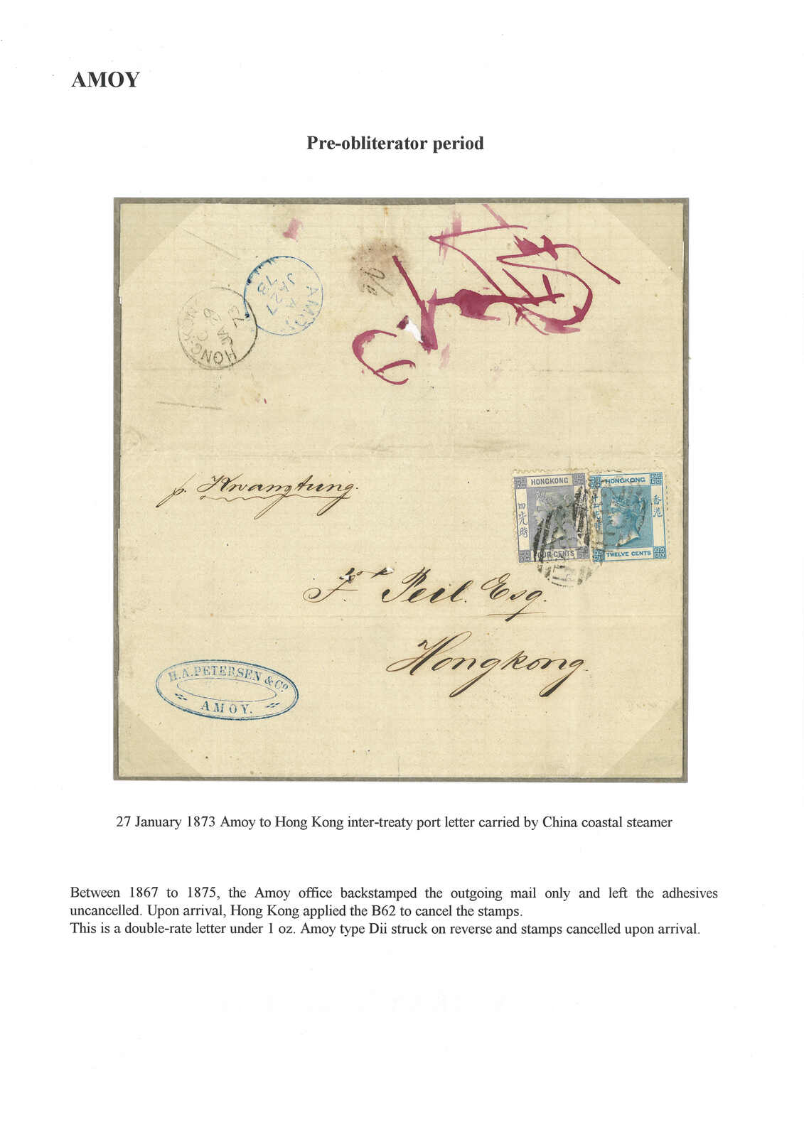 1873 Amoy (27 Jan) to Hong Kong. Entire letter, applied with Amoy BPO type Dii cds in blue on reverse. On front f.w. Hong Kong QV 4c + 12c, tied by B62 obliterator, matching with Hong Kong arrival cds (29 Jan). On front with