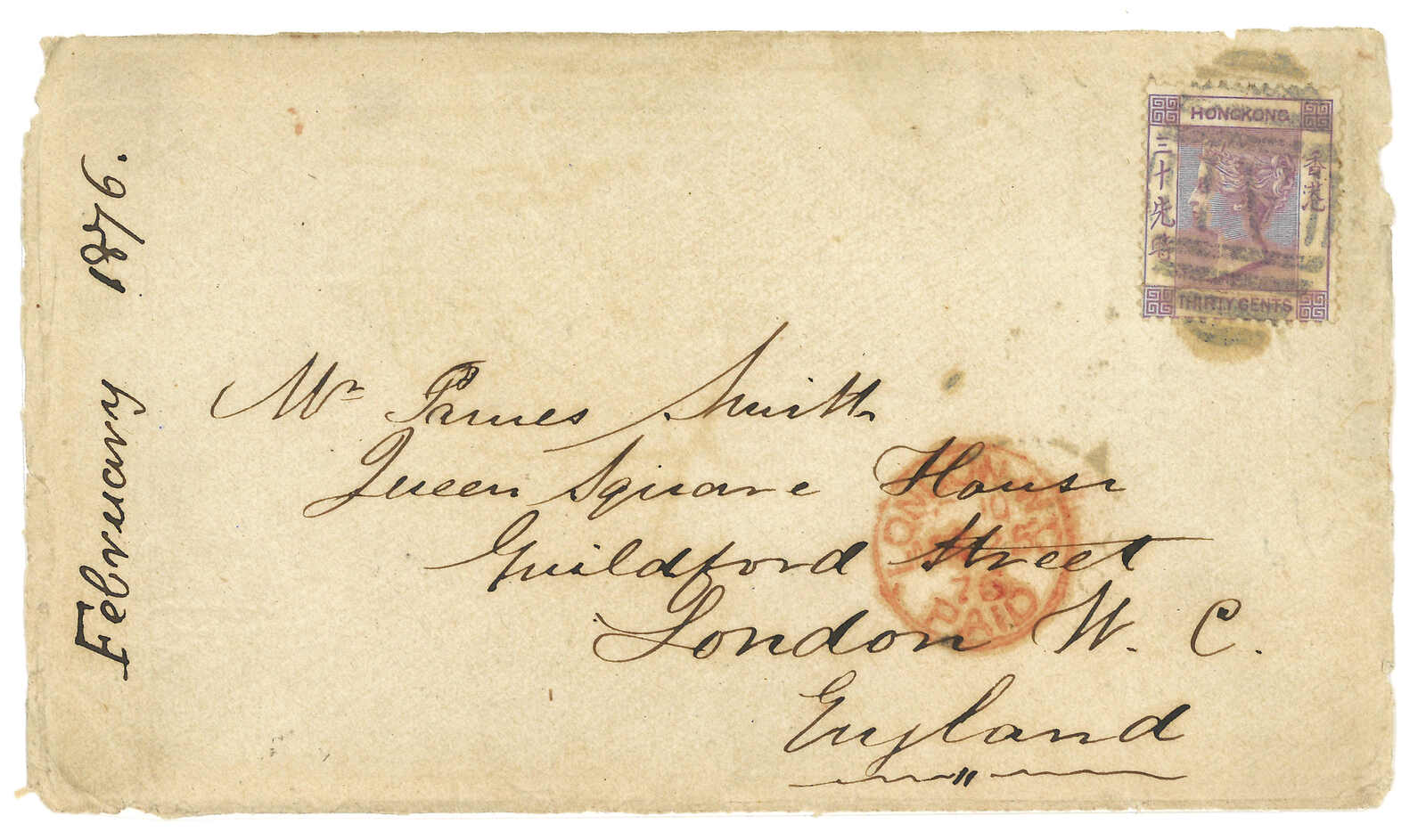 1876 Amoy (Feb) to England. Cover front, f.w. Hong Kong QV 30c, tied by A1 obliterator in blue. Webb recorded 18 covers and postcards with A1 obliterator. It is the only one with blue A1 obliterator.
