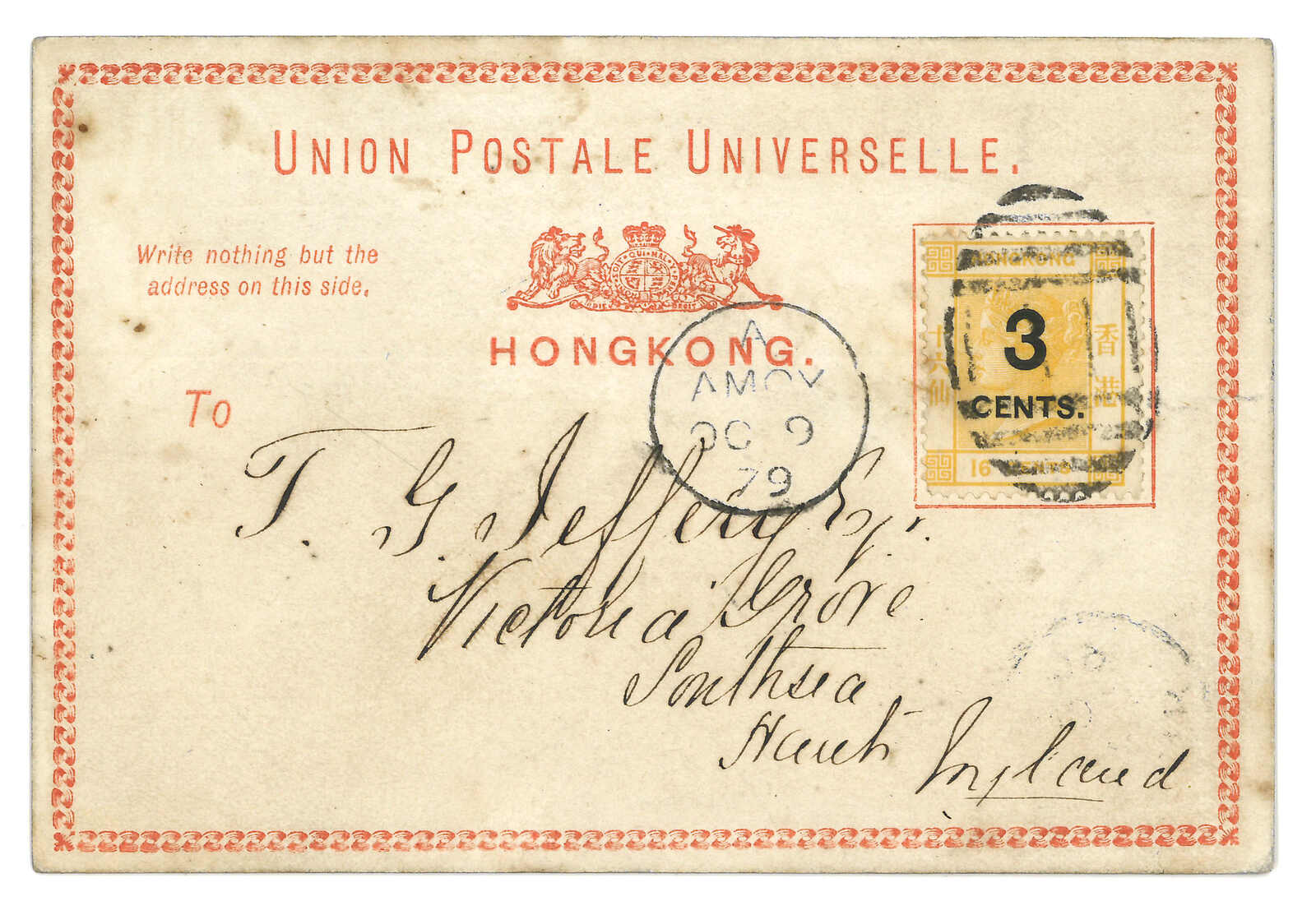 1879.10.9 廈門寄英國。香港明信片貼維多利亞女皇像改值3仙蓋16仙(楊目P1a),銷A1殺手戳,旁鈐廈門英局Webb E型日戳。11.25抵Portsmouth。為六件蓋有A1殺手戳的明信片之一。(Image 1)
