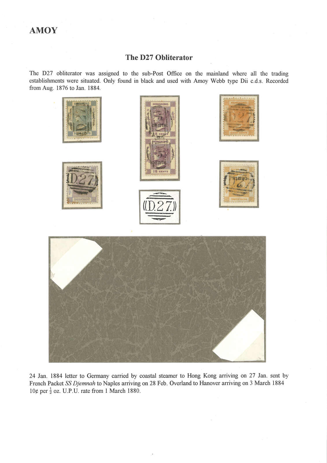 1884 Amoy (24 Jan) to Germany, f.w. Hong Kong 10c, tied by D27 obliterator, alongside with Amoy BPO Webb type D cds. Transit Hong Kong (27 Jan). Arrived Germany. Webb recorded 17 covers with D27 obliterator.