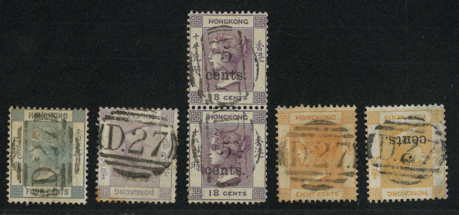一組六枚香港維多利亞女皇像舊票,銷D27殺手戳。(Image 1)