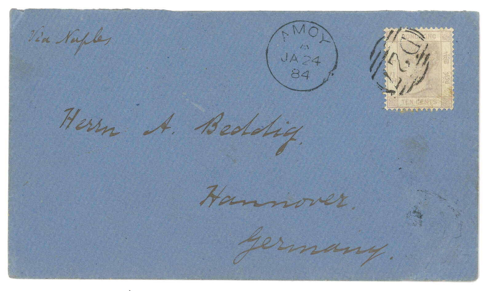 1884.1.24 廈門寄德國,貼香港維多利亞女皇像10仙,銷D27殺手戳,旁鈐廈門英局Webb D型日戳。1.27經香港。抵德國。Webb記錄中,鈐D27殺手戳之信封僅有十七件。(Image 1)