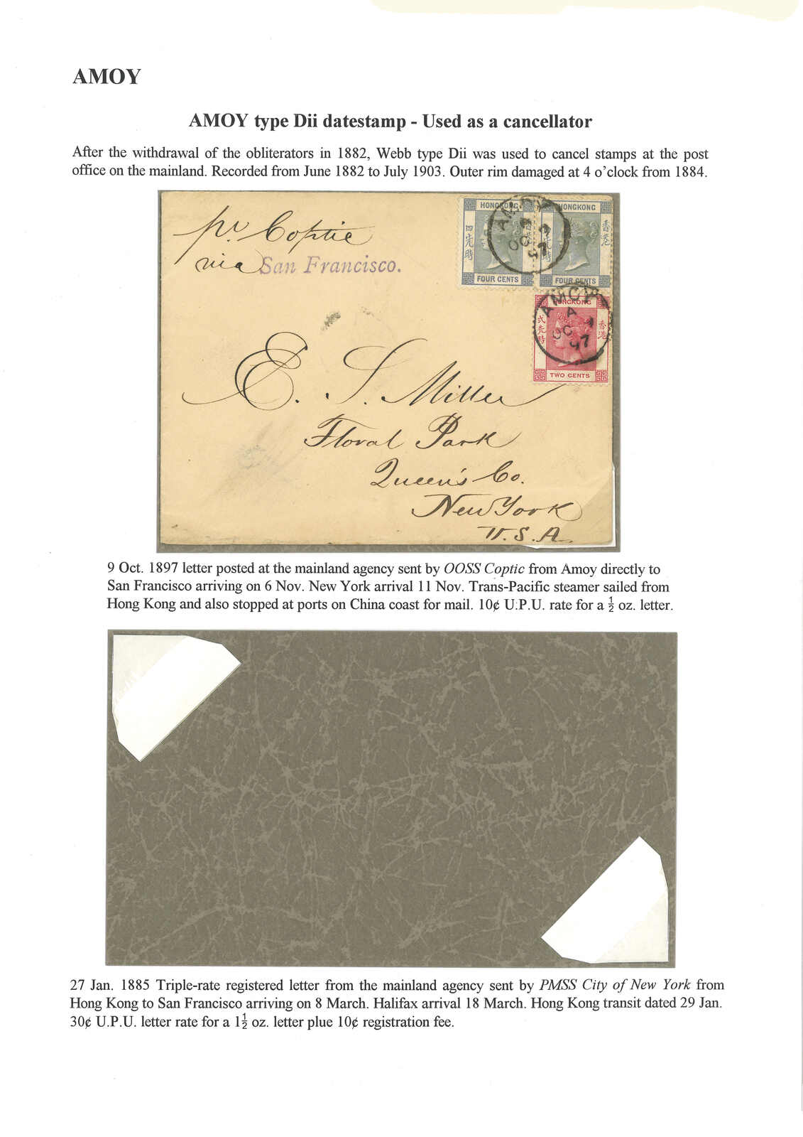 1897 Amoy (9 Oct) to USA, f.w. Hong Kong QV 4c in pair + 2c for 10c UPU rate, tied by Amoy BPO Webb type Dii cds. Showing "Pr Coptic" annotation. Transit San Francisco (6 Nov). Arrived New York (11 Nov).