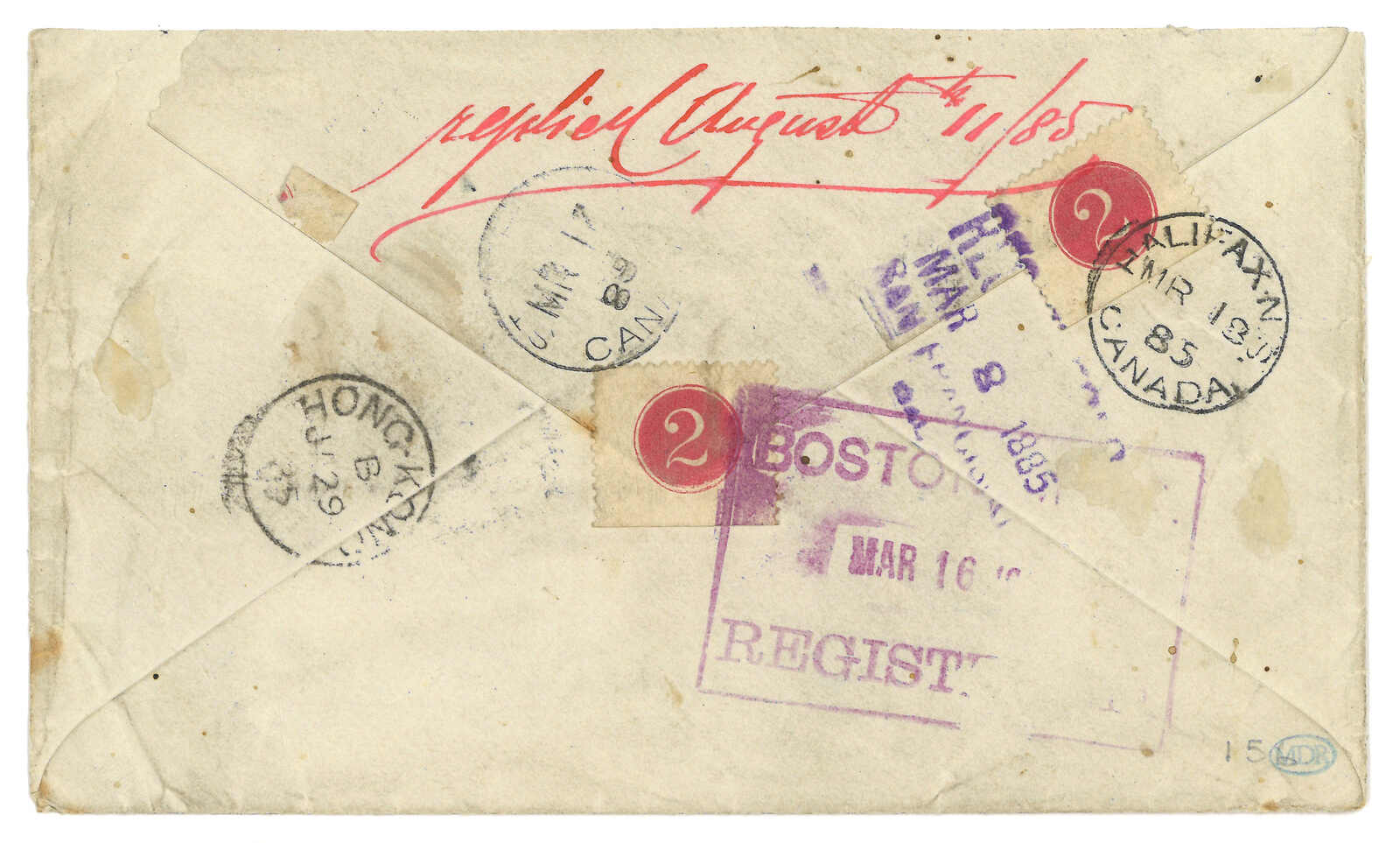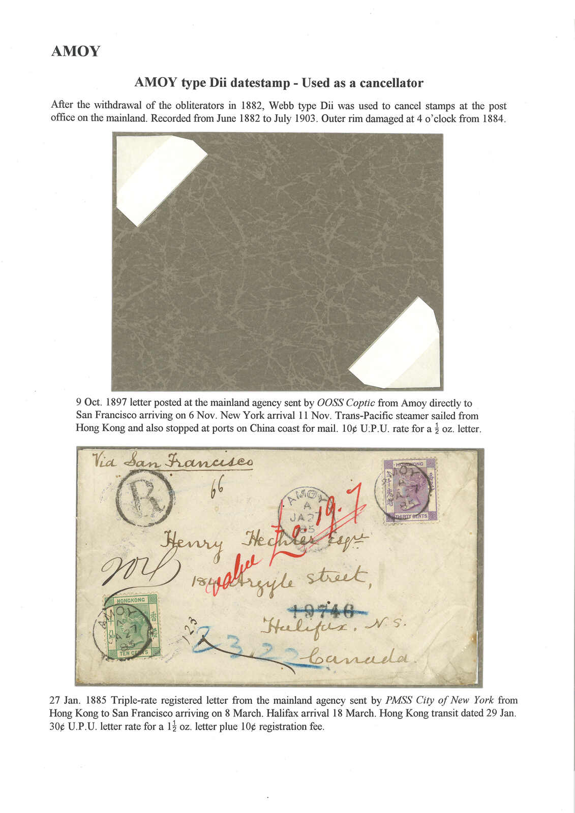 1885.1.27 廈門寄加拿大,右上貼香港維多利亞女皇像30仙,左下貼10仙,銷廈門英局Webb Dii型日戳,旁鈐R章及寫有“via San Francisco”批示。1.29經香港,3.8經三藩市。3.18抵Halifax。(Image 1)