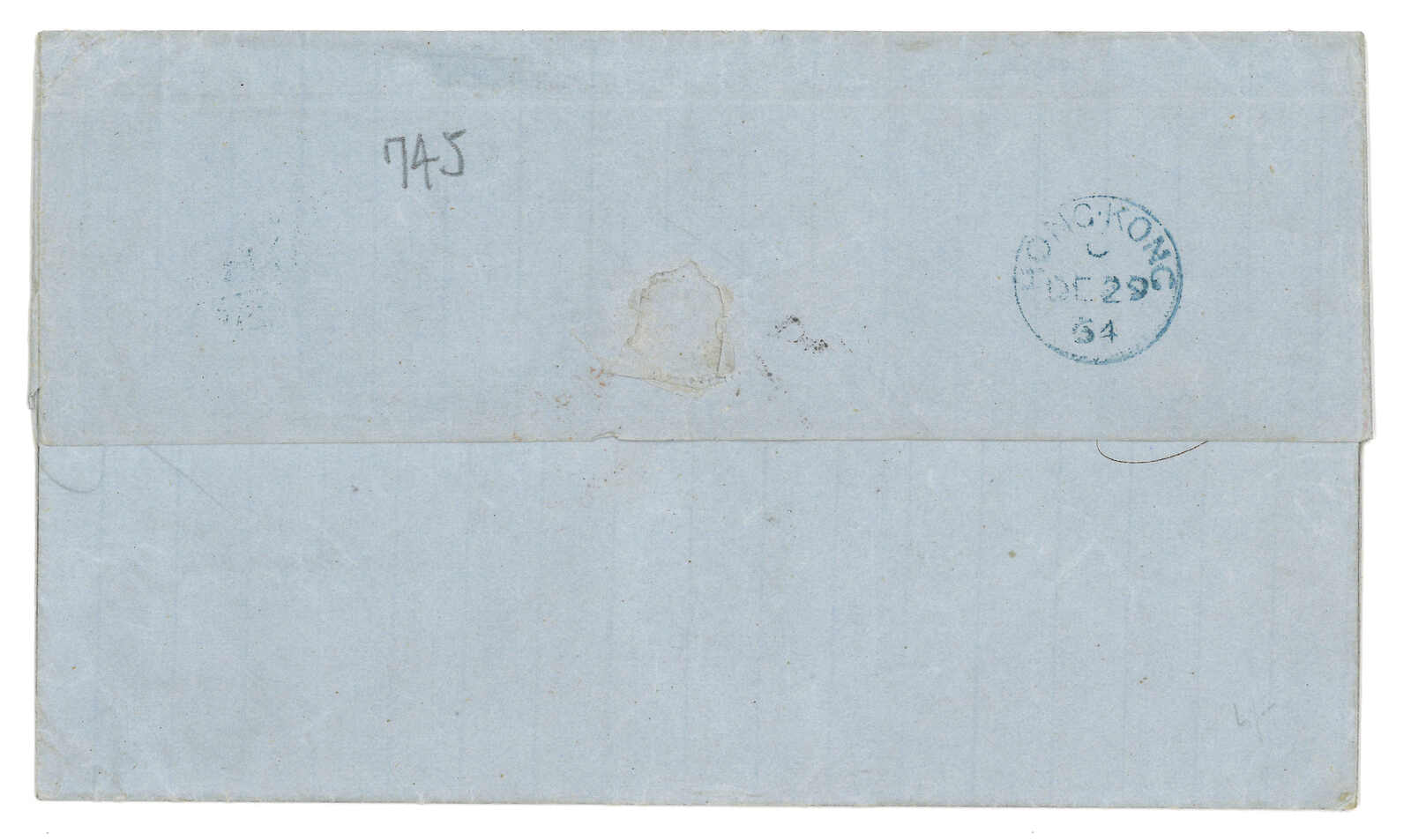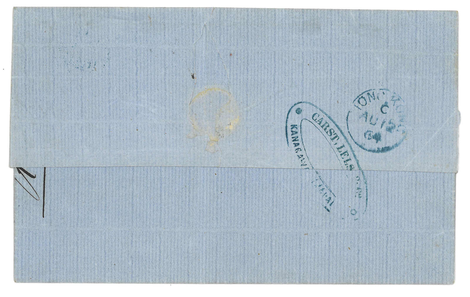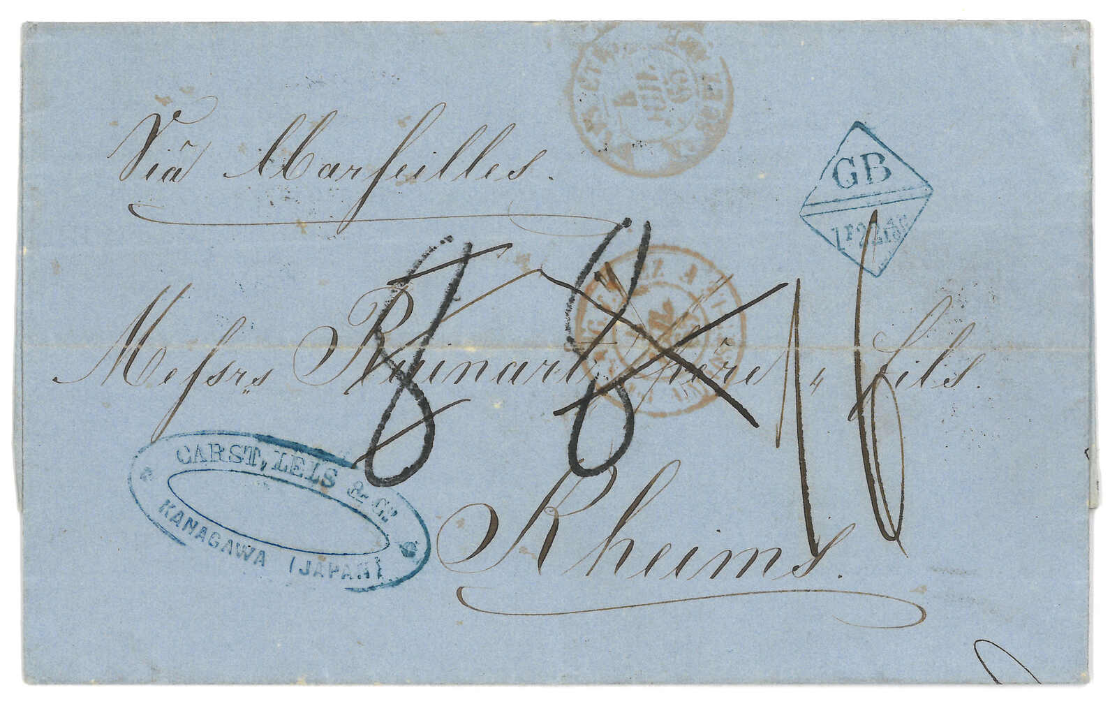 1864 Yokohama (24 Jul) to France. Entire letter, rated “8”, applied with “Carst & Lels Co. / Kanagawa” oval company seal and Webb type G “GB / 1F 22 4/10c” diamond accountancy mark in violet. Transit Hong Kong (12 Aug),