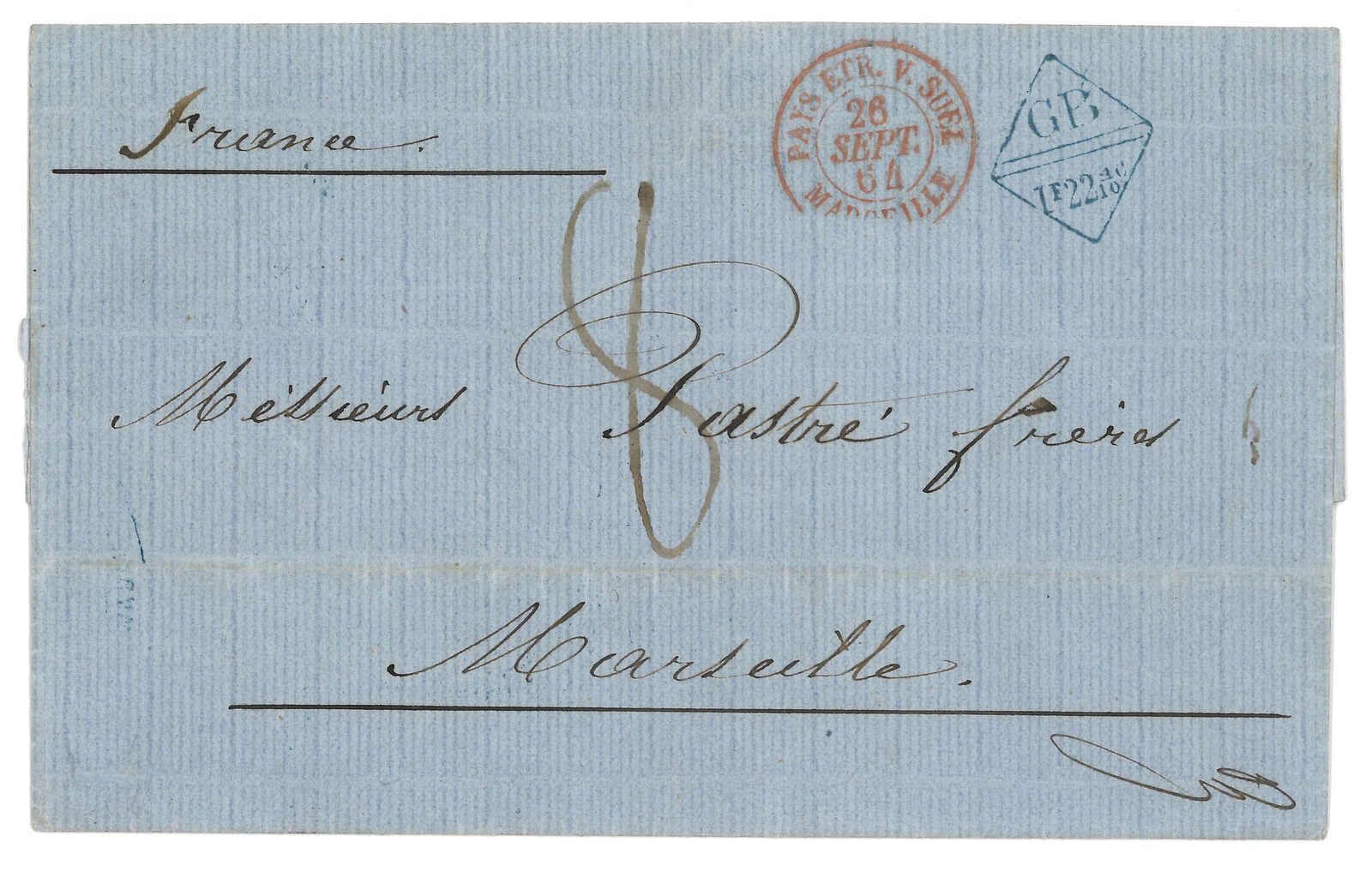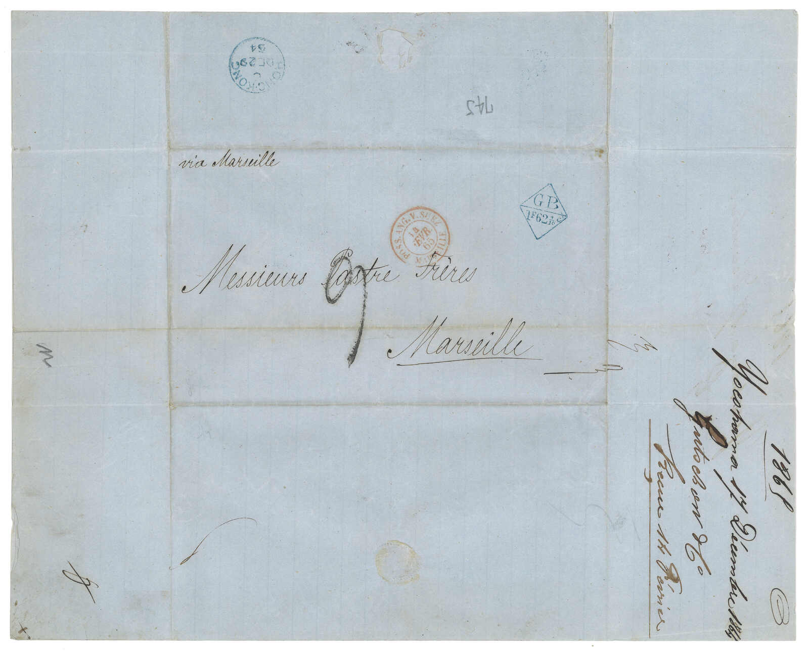 1864.12.17 橫濱寄法國。郵簡,寫有“via Marseilles”批示及“9”郵資戳記,鈐香港C字12.29藍色中轉戳及Webb H型“GB / 1F 62 4/10c”菱形計價戳記。2.14經蘇伊士-馬賽。(Image 1)