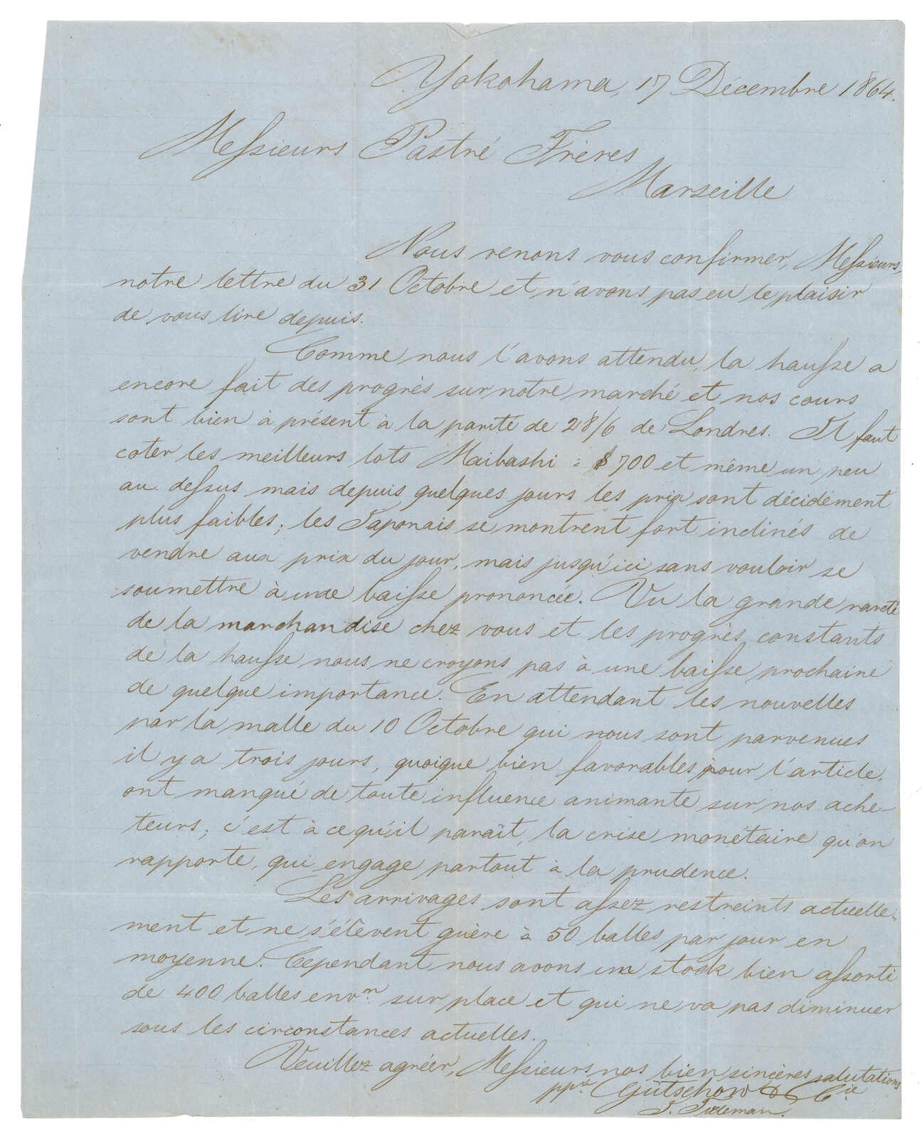1865 Yokohama (27 Aug) to France. Entire letter, sent “via Marseilles” and rated “8” but crossed out to “16”, applied with “Carst & Lels & Co. / Kanagawa” oval company seal and Webb type G “GB / 1F22 -4/10C” diamond