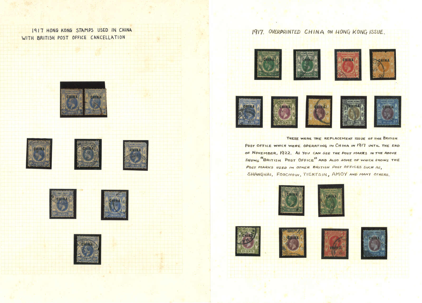 1917-1921 a collection of about 60 Hong Kong KGV ovpt. CHINA used stamps on exhibit pages, tied by Canton, Tientsin, Foochow, Amoy and other BPO cds. Containing several $1 stamps.