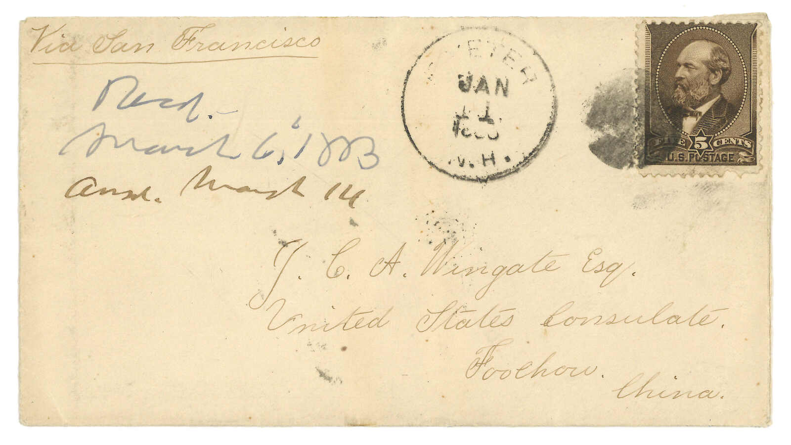 1883 USA (9 Jan) to Joseph C. A. Wingate, US Consul at Foochow, f.w. US 5c, tied by obliterator, alongside with cds. Transit Boston (12 Jan), San Francisco (19 Jan), Hong Kong (27 Feb). Arrived with Foochowfoo BPO Webb type B