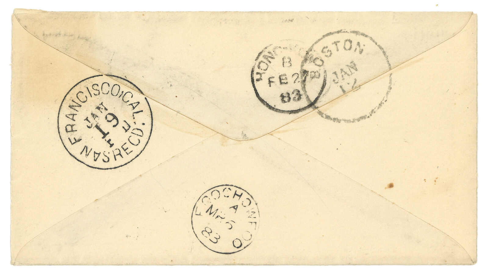 1883.1.9 美國寄駐福州領事Joseph C. A. Wingate,貼美國票5分,銷殺手戳,旁鈐圓形日戳。1.12經波士頓,1.19經三藩市,2.17經香港。3.6抵福州英局,鈐Webb B型日戳。經香港進口福州英局之出色進口例。(Image 1)