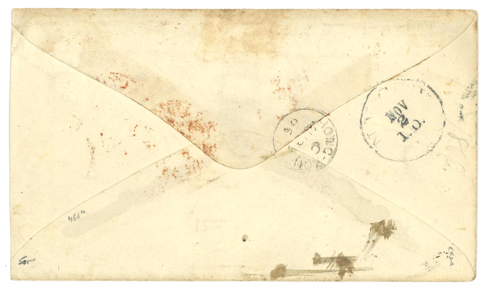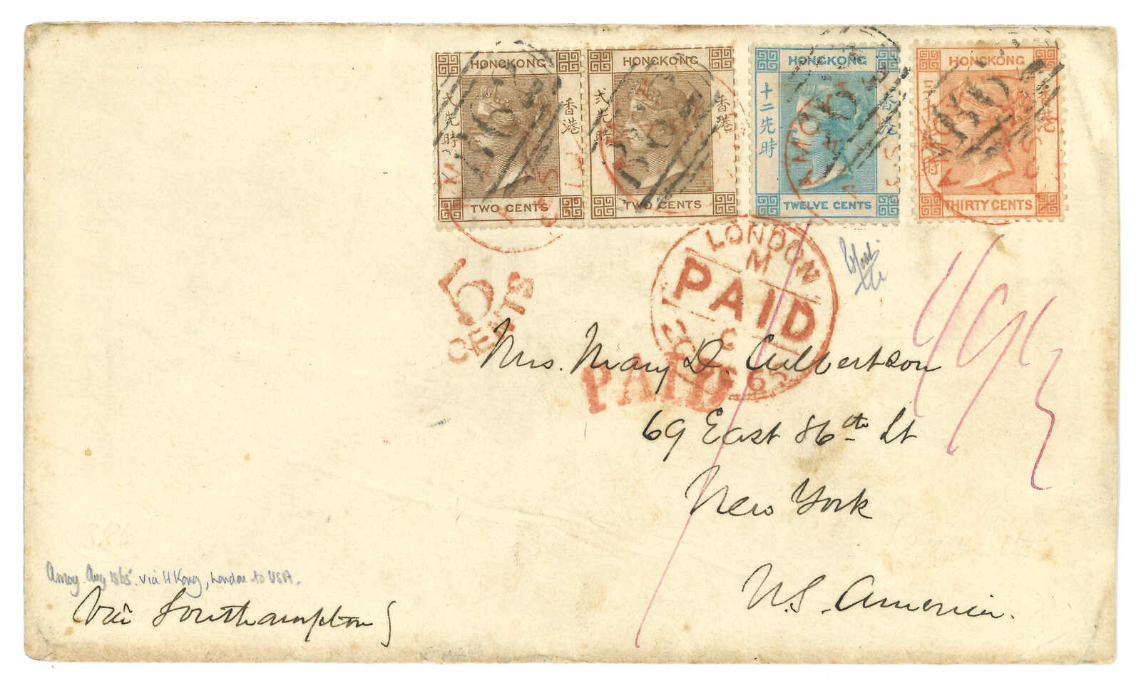 1865 (Aug 23) Culberton envelope addressed to New York “Via Southampton” bearing HK QV 1863-71 2c brown pair, 12c pale greenish blue, and 30c vermilion tied by the “AMOY PAID” c.d.s. in red, Hong Kong “B62” in black with London