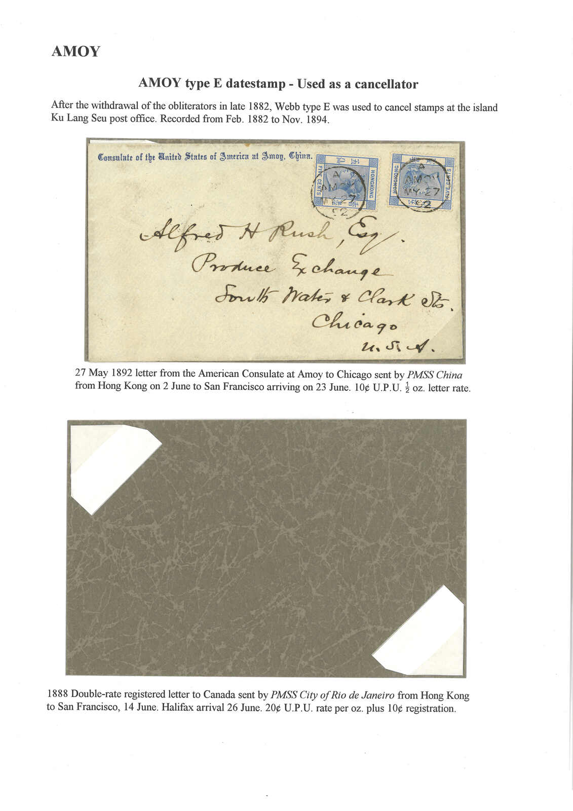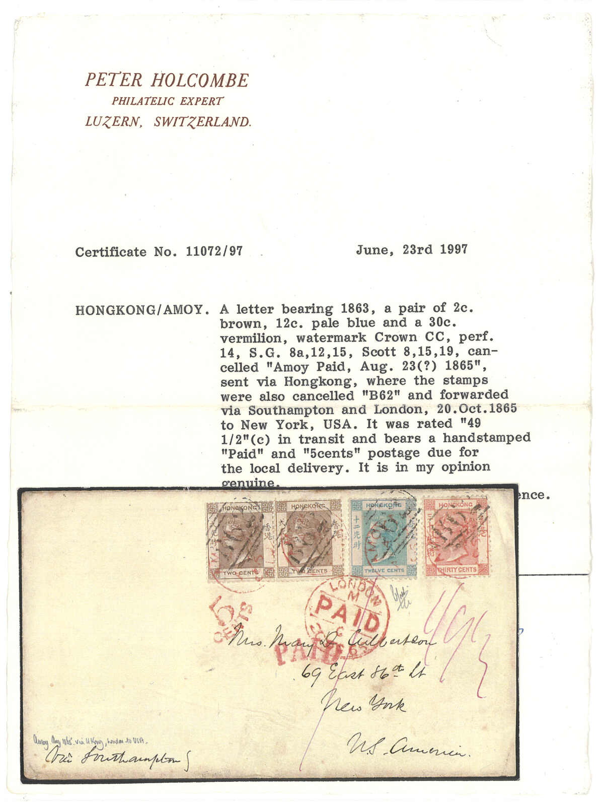 the use of A1 and D27 obliterator. Pearson recorded about 16 stamps QV stamps applied with this cds while Webb recorded 13. An exceptionally fine and desirable example of the rare AMOY PAID on HK QV stamps Culberton cover. Holcombe Certificate 1997.