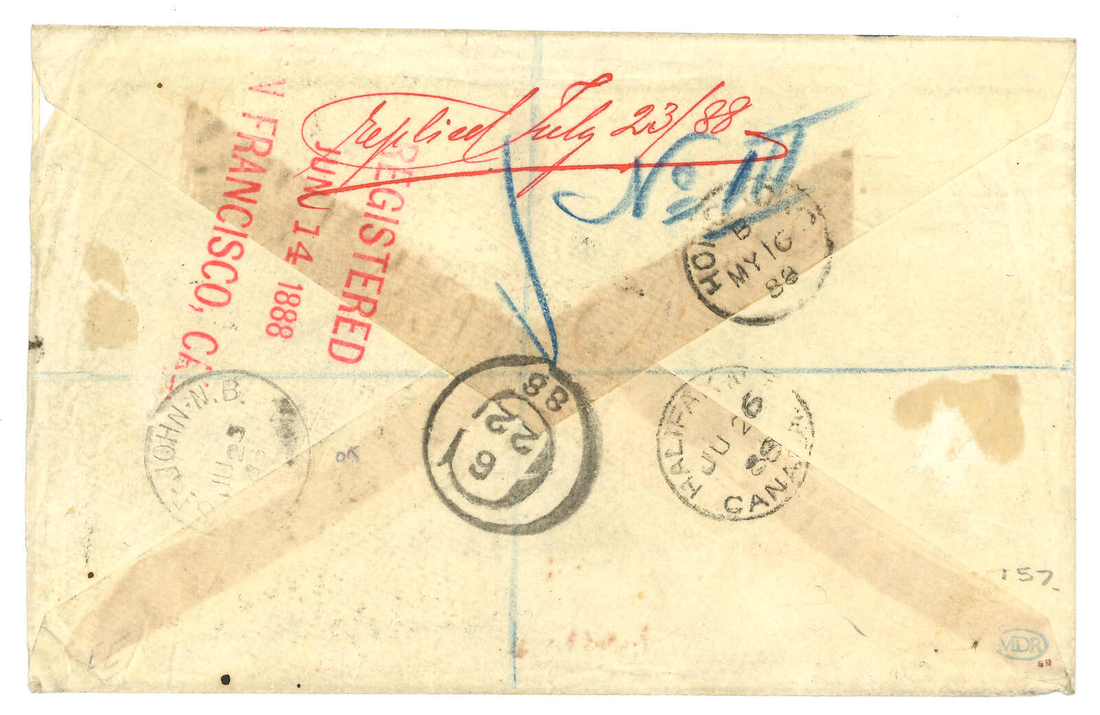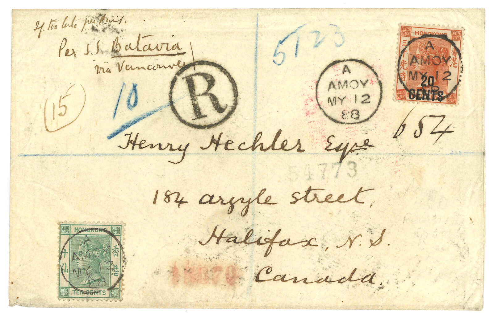1888.5.12 廈門寄加拿大,右上貼香港維多利亞女皇像改值20仙蓋30仙,左下貼10仙,合10仙萬國郵盟郵資,銷廈門英局Webb E型日戳,旁鈐R章及“Per SS Batavia via Vancouver”批示。7.16經香港。6.26抵Halifax。(Image 1)
