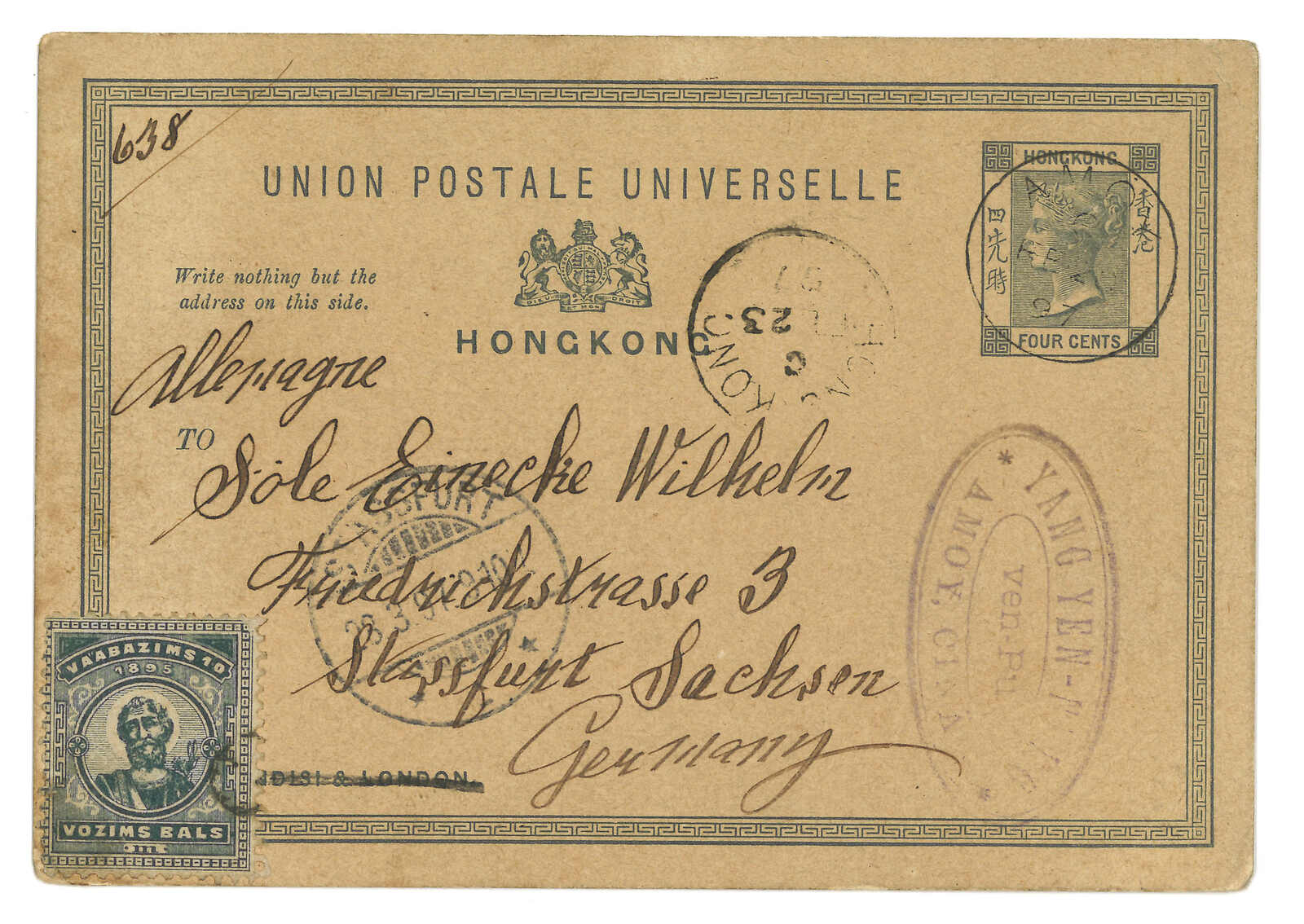 1897 Amoy (20 Feb) to Germany. Hong Kong QV 4c PSC, tied by Amoy BPO Webb type F (index C) cds. Transit Hong Kong (23 Feb). Arrived Stassfurt (28 Mar).