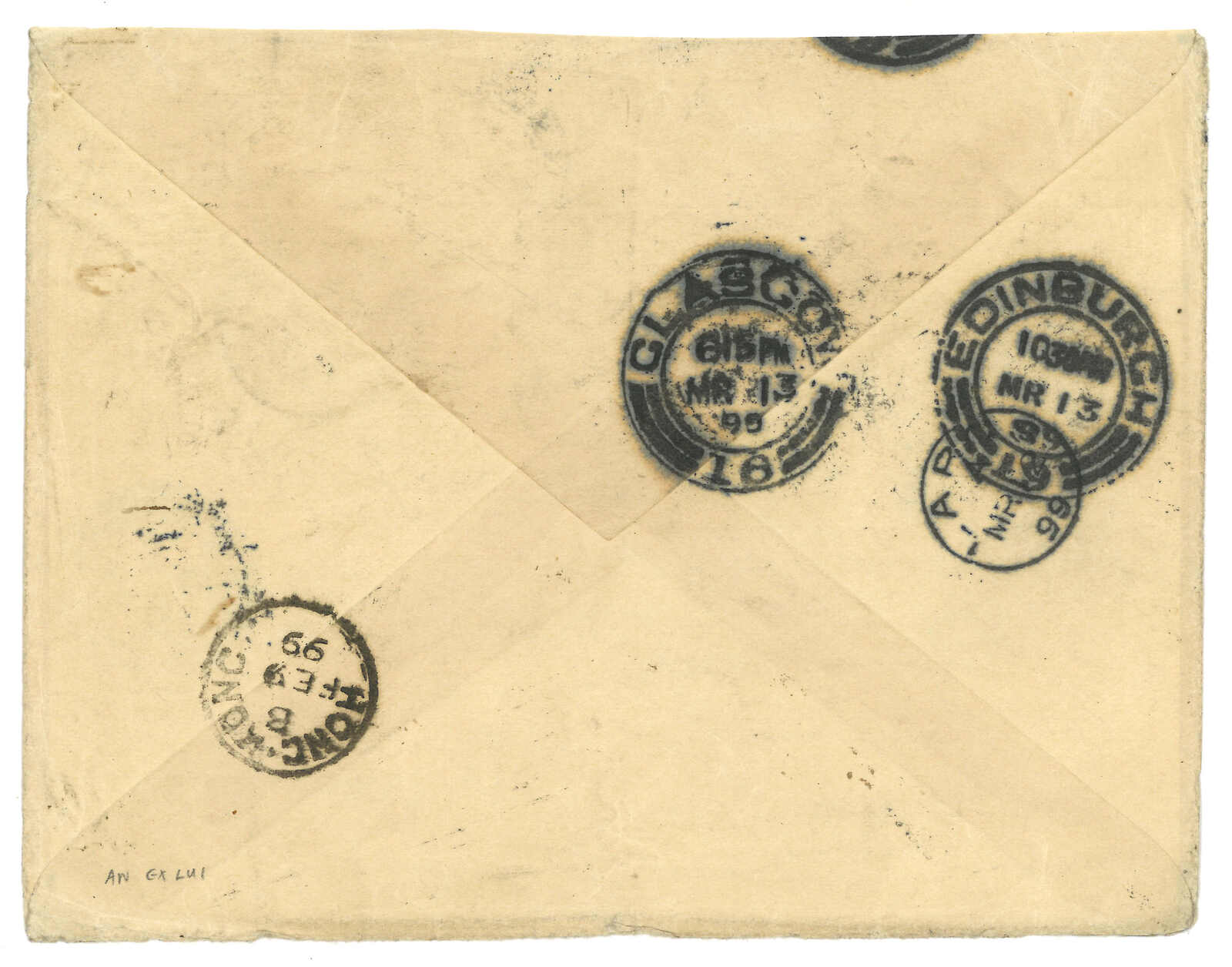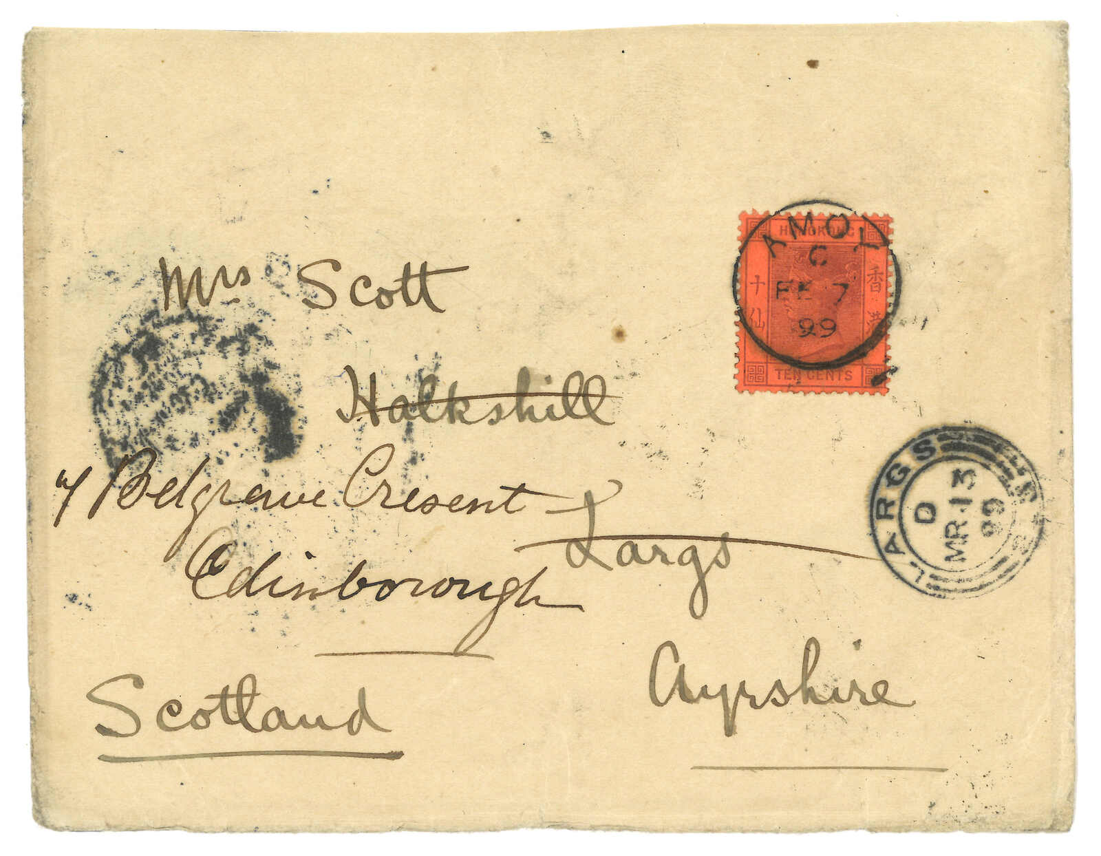 1899.2.7 廈門寄蘇格蘭Largs,改寄愛丁堡,貼香港維多利亞女皇像10仙,銷廈門英局Webb F型(C字)日戳。2.9經香港,3.13抵Largs,同日改寄愛丁堡。(Image 1)