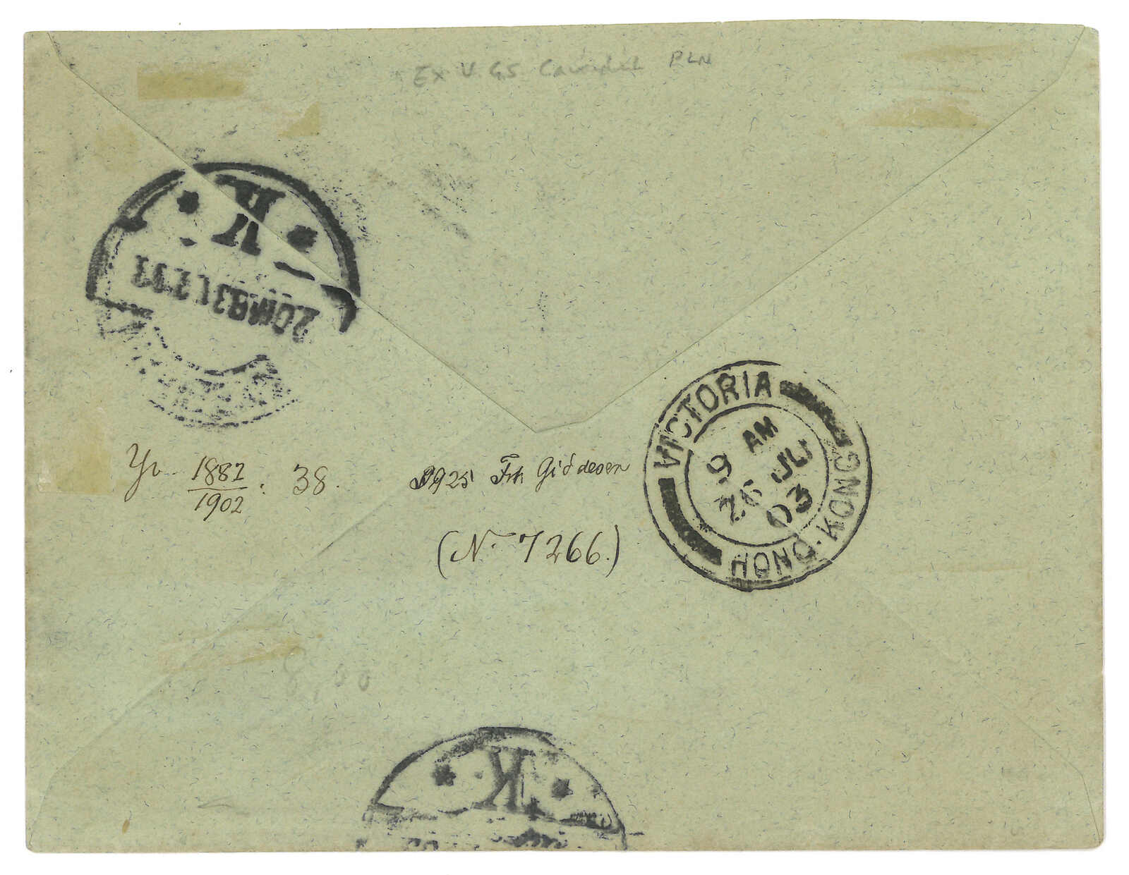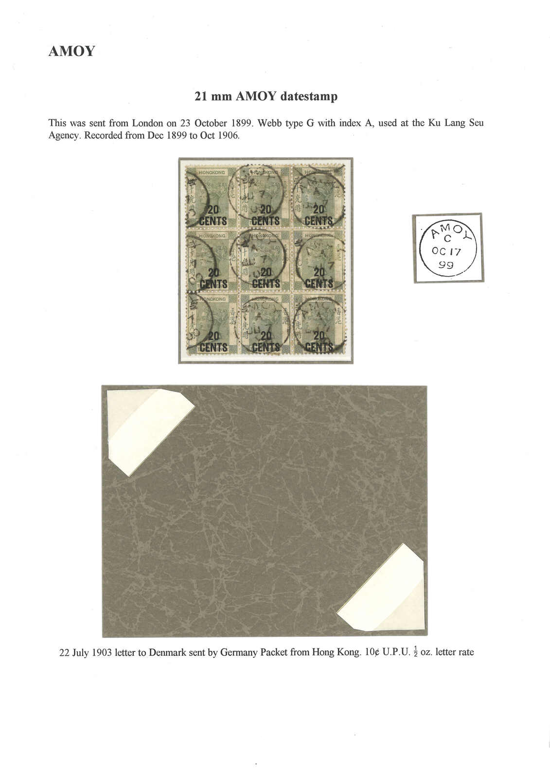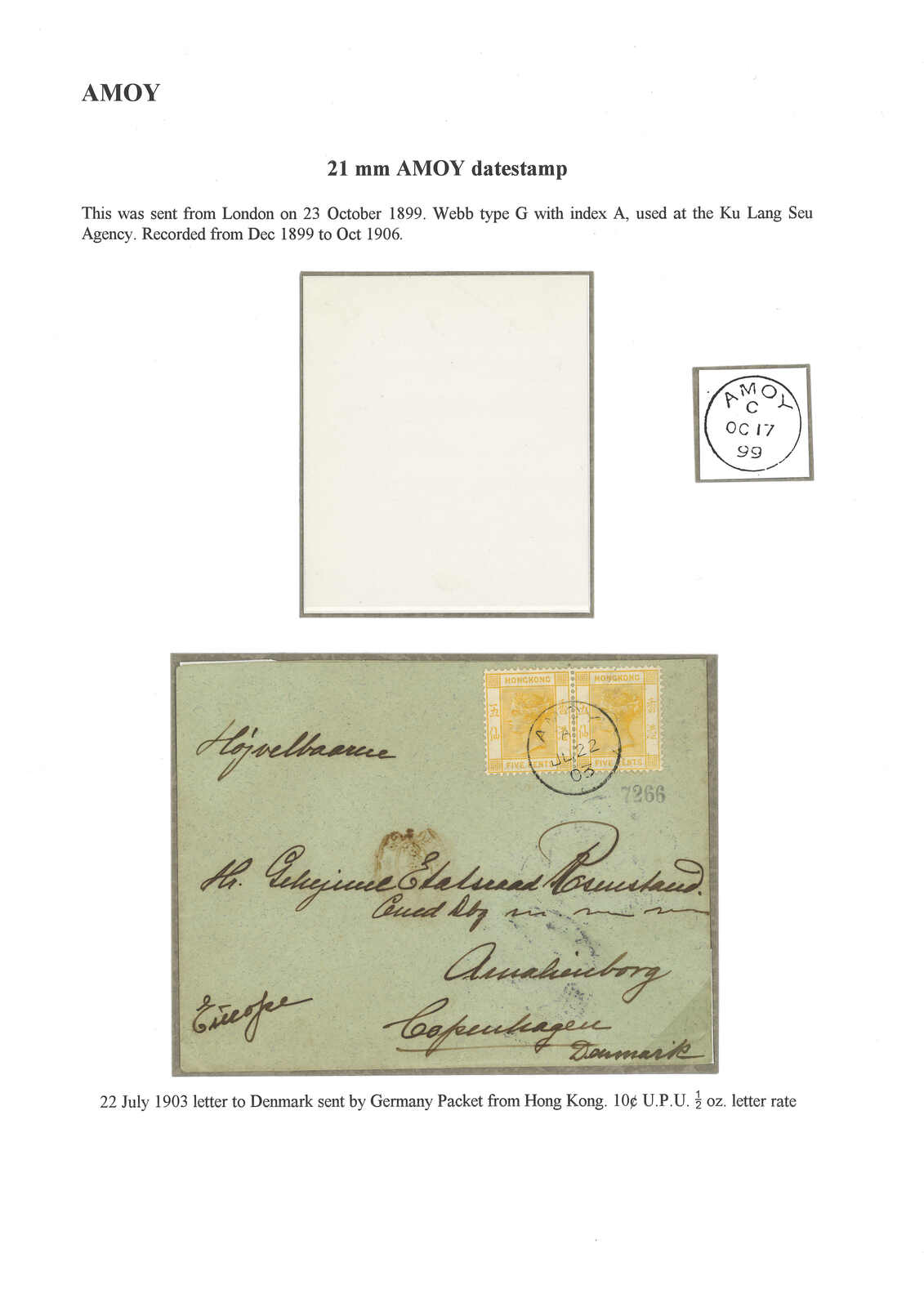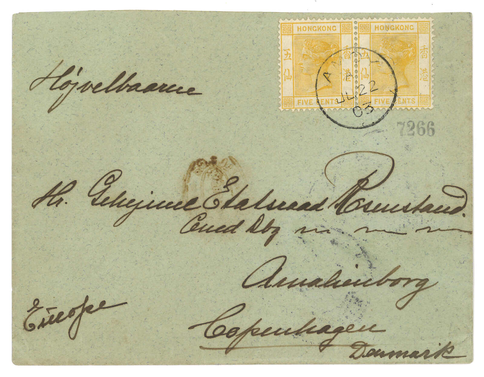 1903 Amoy (22 Jun) to Denmark, f.w. Hong Kong QV 5c in pair for 10c UPU rate, tied by Amoy BPO Webb type G (index A) cds. Transit Hong Kong (26 Jun).