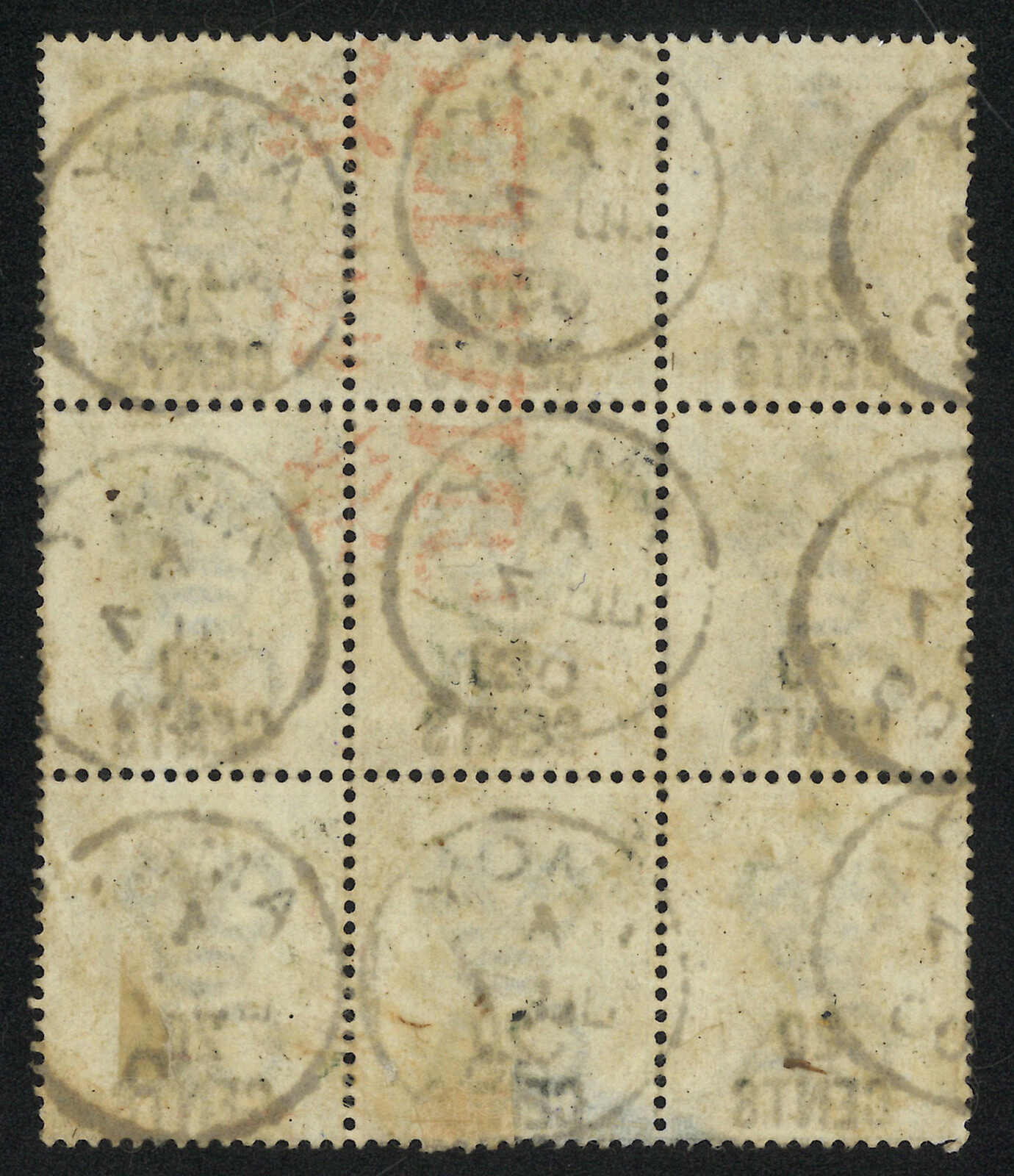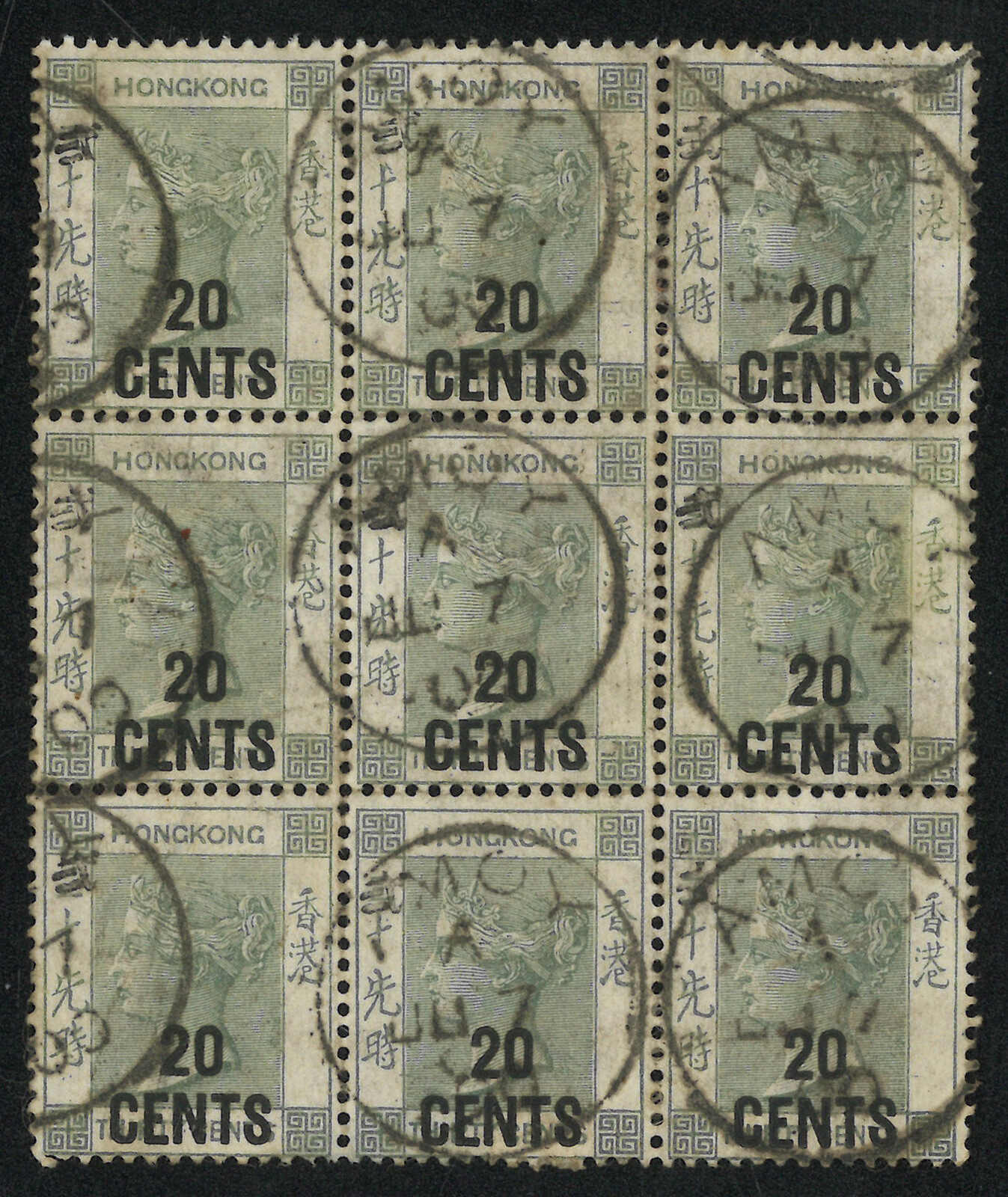 Hong Kong QV surch 20c/30c with Chinese character in block of 9, used by Amoy BPO type G (index A) cds.