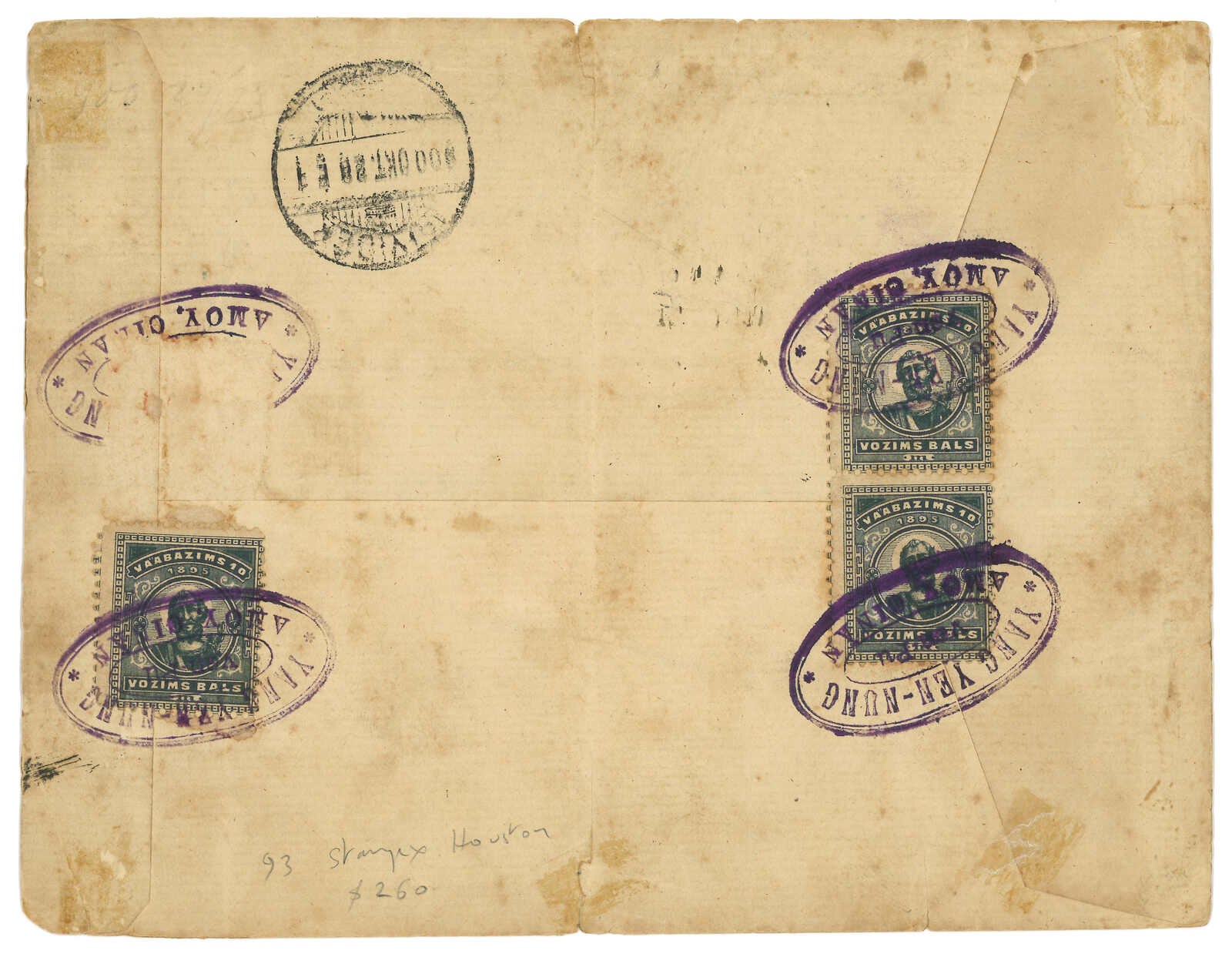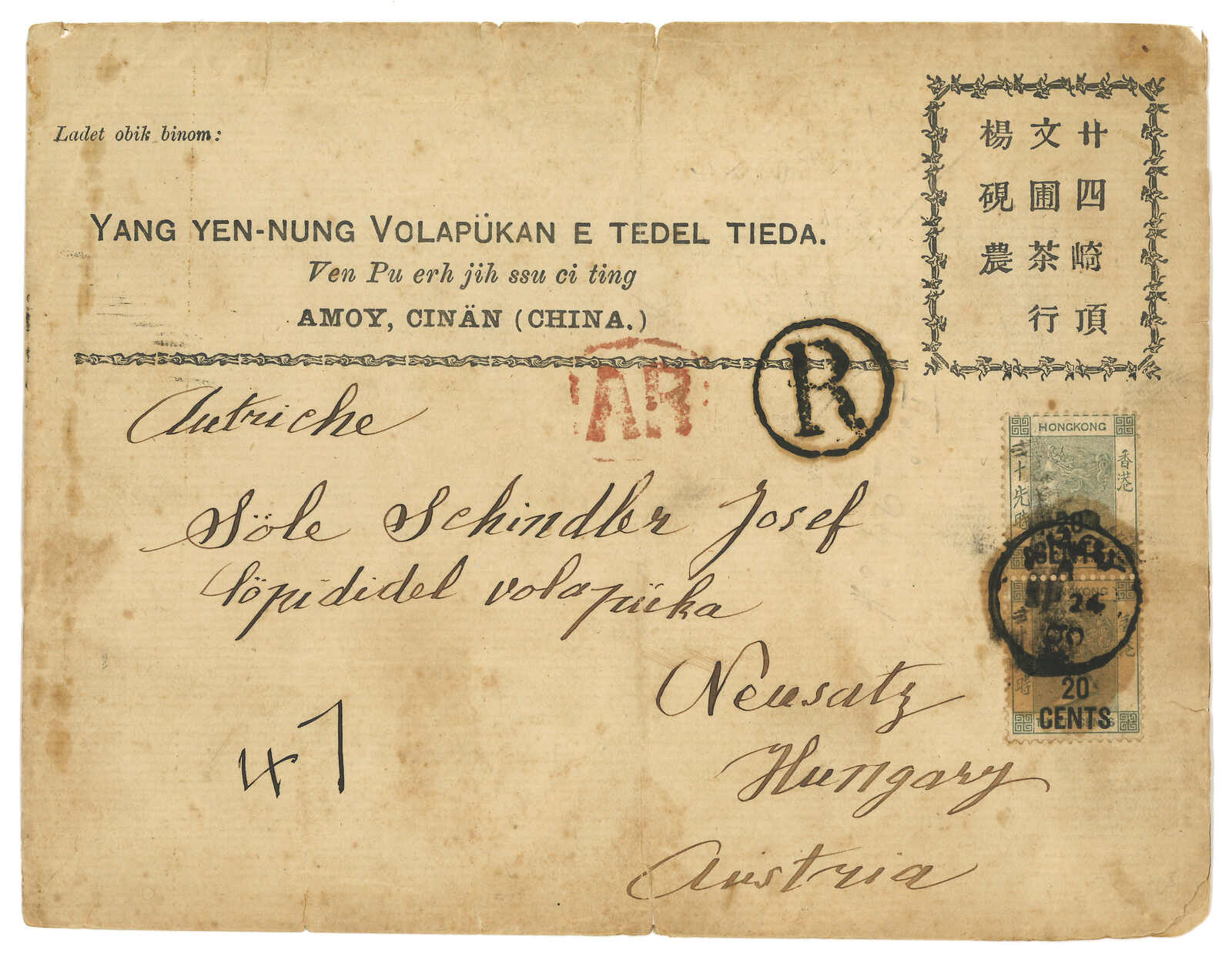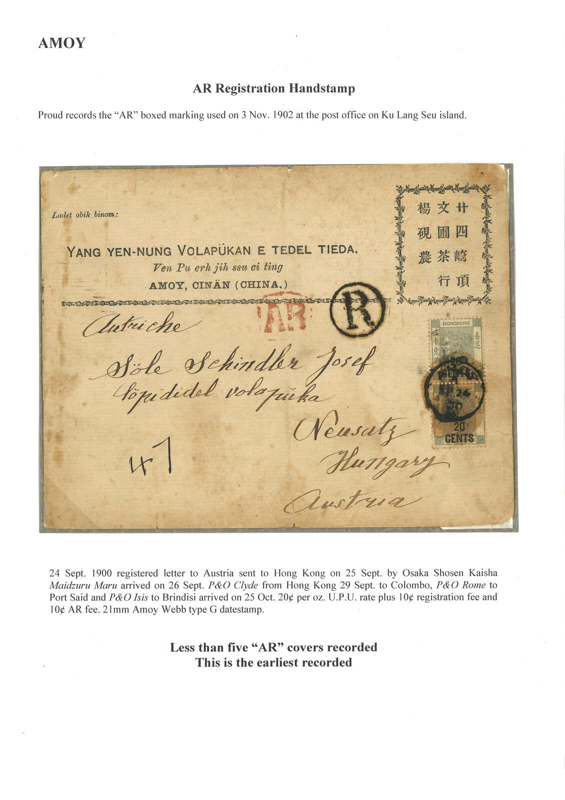 1900.9.24 廈門寄香港。雙掛號封,貼香港維多利亞女皇像改值20仙蓋30仙雙連,合40仙雙倍重量 + 雙掛號郵資,銷廈門英局Webb G型日戳,旁鈐R章及紅色AR章。同類型雙掛號封記錄中不足五件,此為日期最早者。(Image 1)