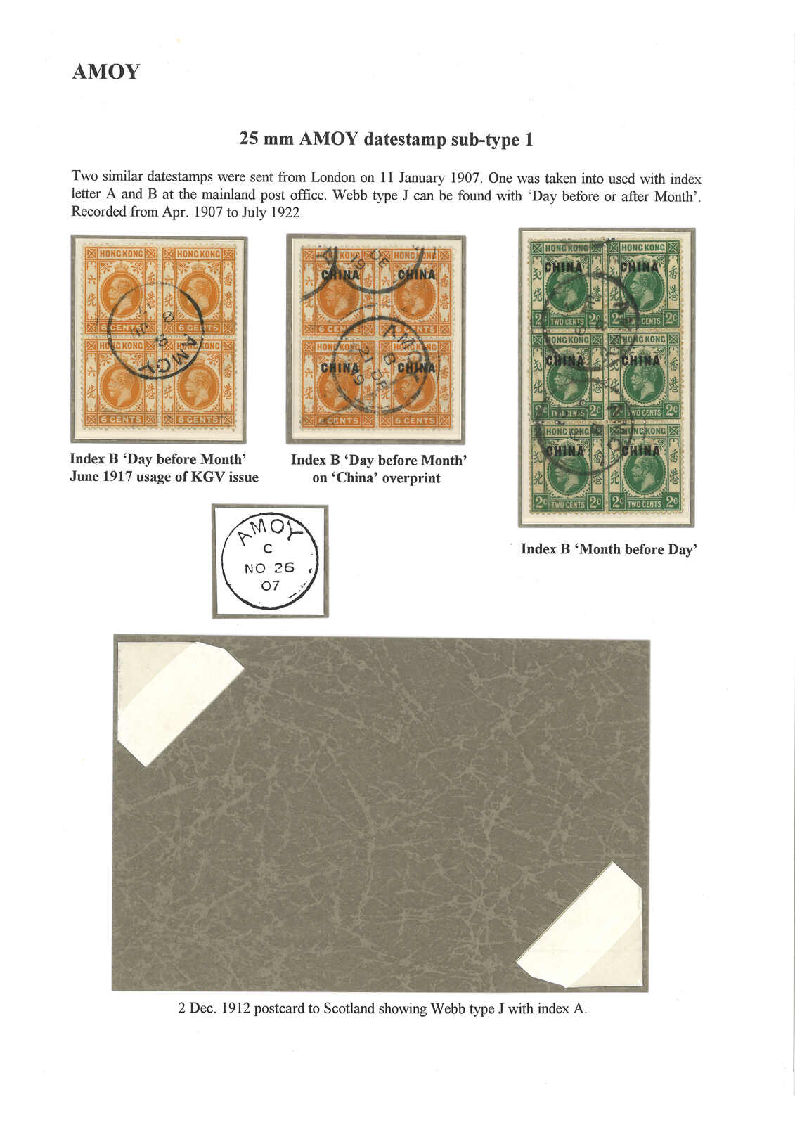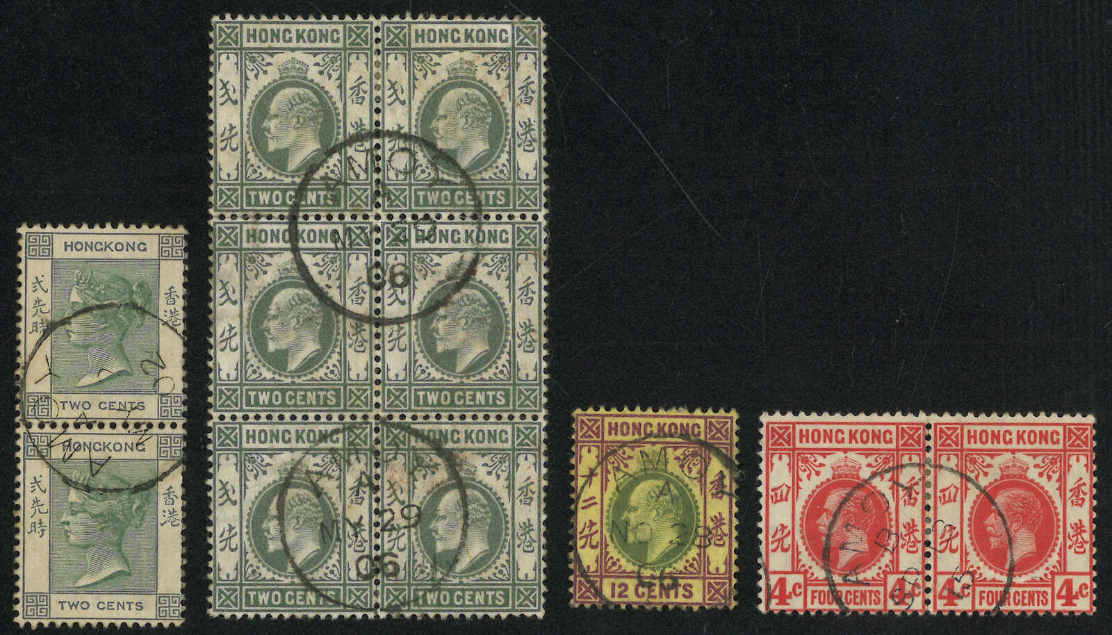 A group of Hong Kong QV and KEVII used stamps, tied by Amoy BPO type Hi (index A) and Hii (index B) cds. Type Hii cds is especially scarce as Webb only recorded three examples.