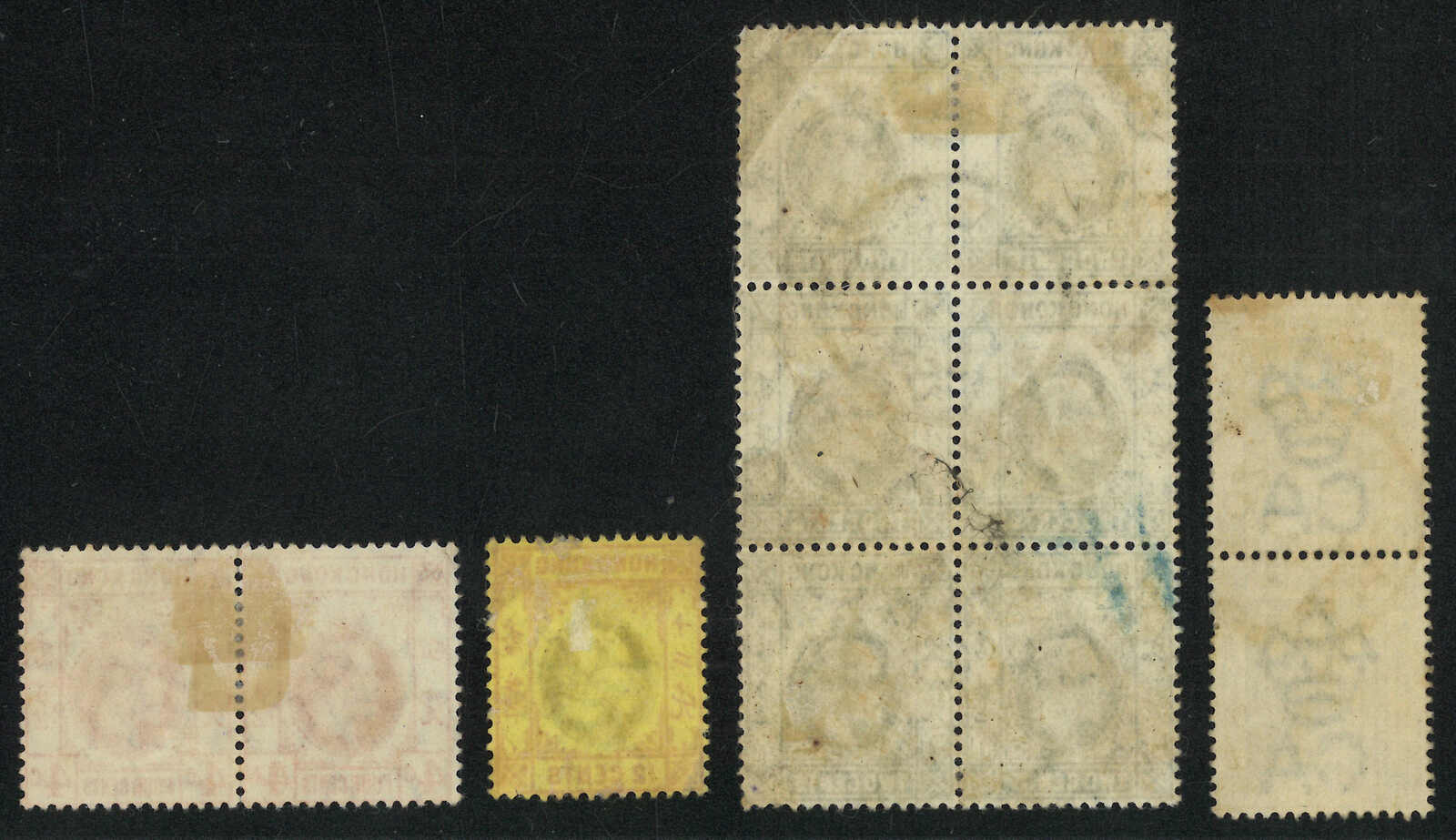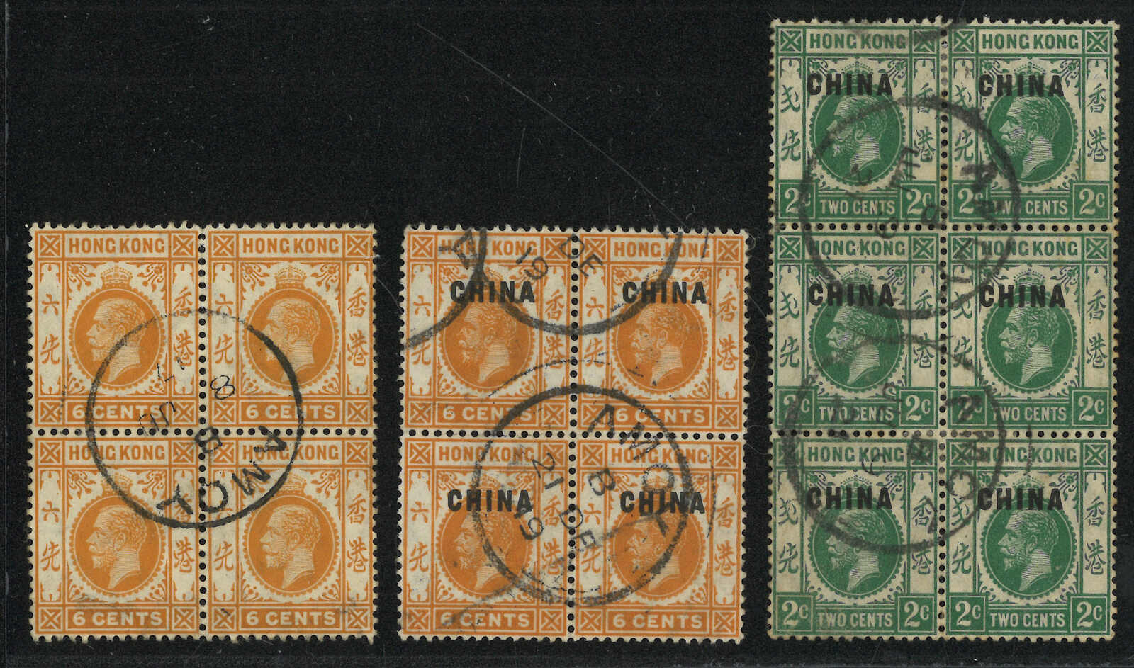A group of 3 Hong Kong KGV and its ovpt. CHINA 6c and 2c multiples, tied by Amoy BPO Webb type Jii (index B) cds. Webb stated that index B, E and F are all scarce on type J cds.