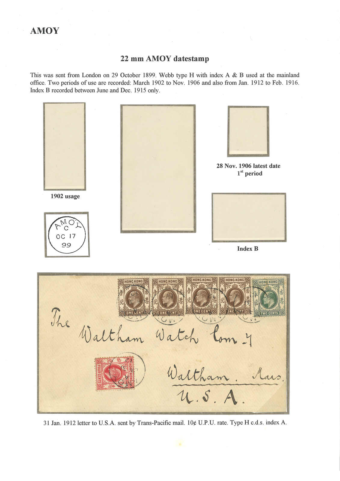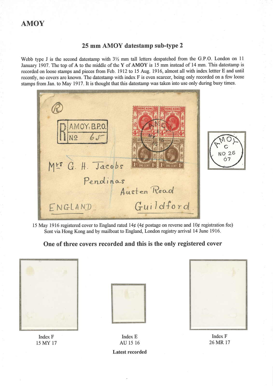 1916.5.15 廈門寄英國。掛號封,前貼香港佐治五世1仙四方連,背貼1仙雙連 + 4仙雙連,背貼1仙x5,銷廈門英局Webb Jii型(E字)日戳,旁鈐Riv型掛號章。6.14抵倫敦。Webb指B字、E字及F字在J型日戳上均少見。此為鈐Jii型E字日戳之三件信封之一,並為當中唯一一件掛號封。張文德醫生著《A new Amoy registered cover type Jiii index E c.d.s.》原件。(Image 1)