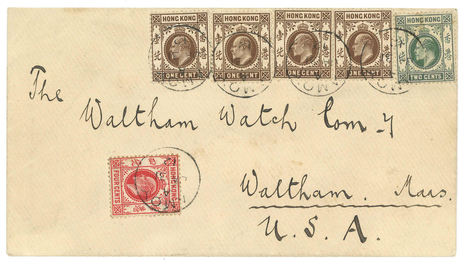 1912 Amoy (31 Jan) to USA, f.w. Hong Kong KEVII 1c x4 + 2c + 4c, tied by Amoy BPO Webb type Hi (index A) cds. Transit Hong Kong (2 Feb).
