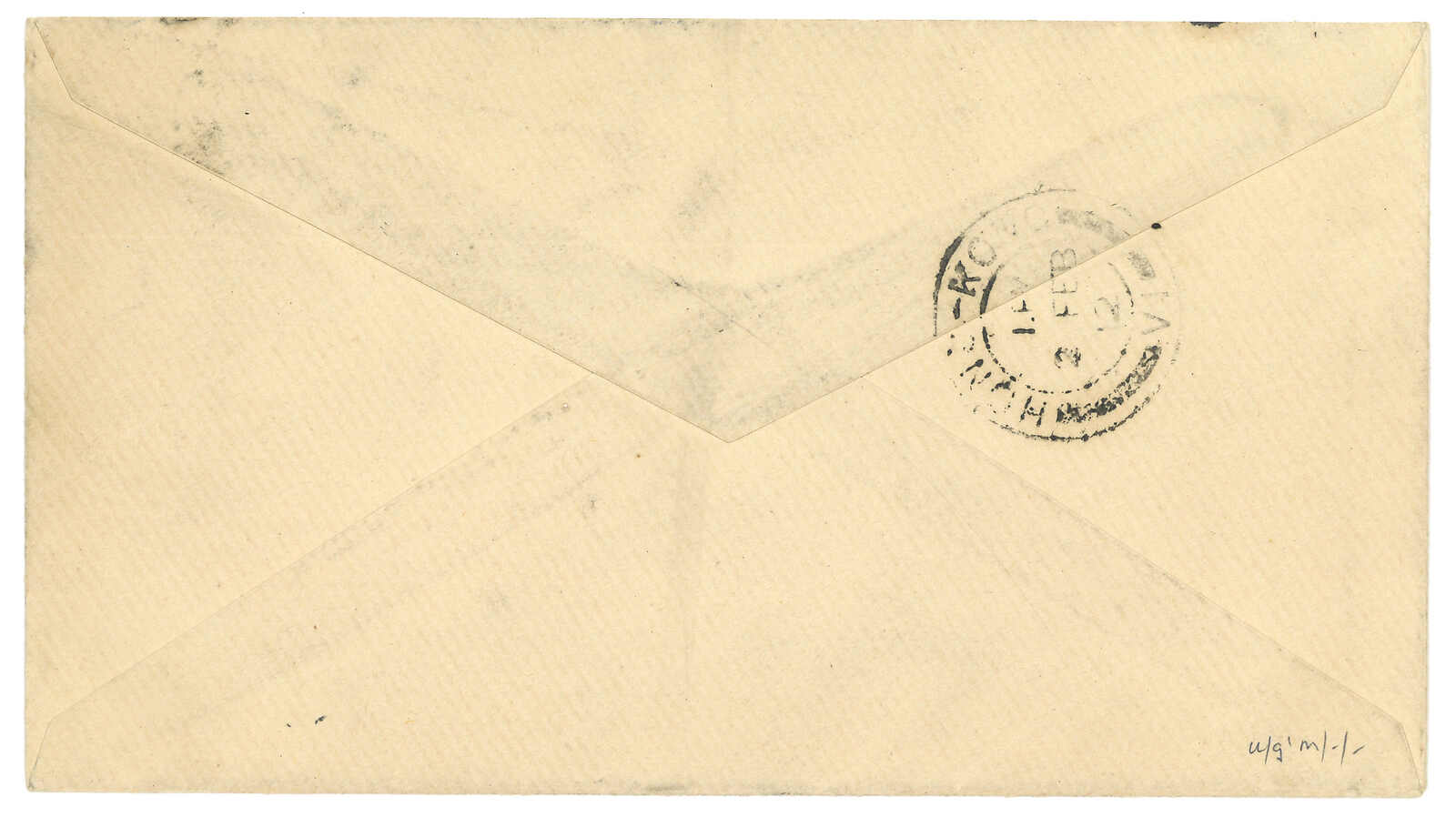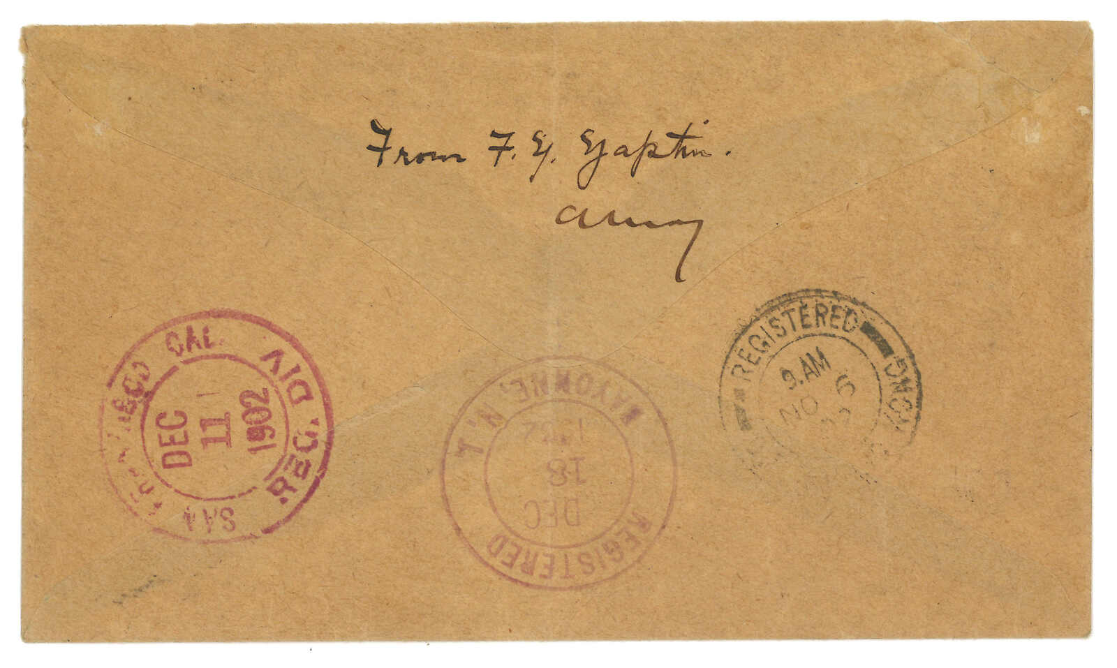 1902.11.1 廈門寄美國,貼香港維多利亞女皇像5仙x4,合20仙掛號郵資,銷廈門英局日戳,旁鈐珍罕之Webb Riii型“HBM POST OFFICE / R / AMOY”掛號章。11.6經香港。12.18抵Bayonne。為8件蓋有Riii型掛號圓章 之信封之一,此為當中品相最佳的一件。(Image 1)