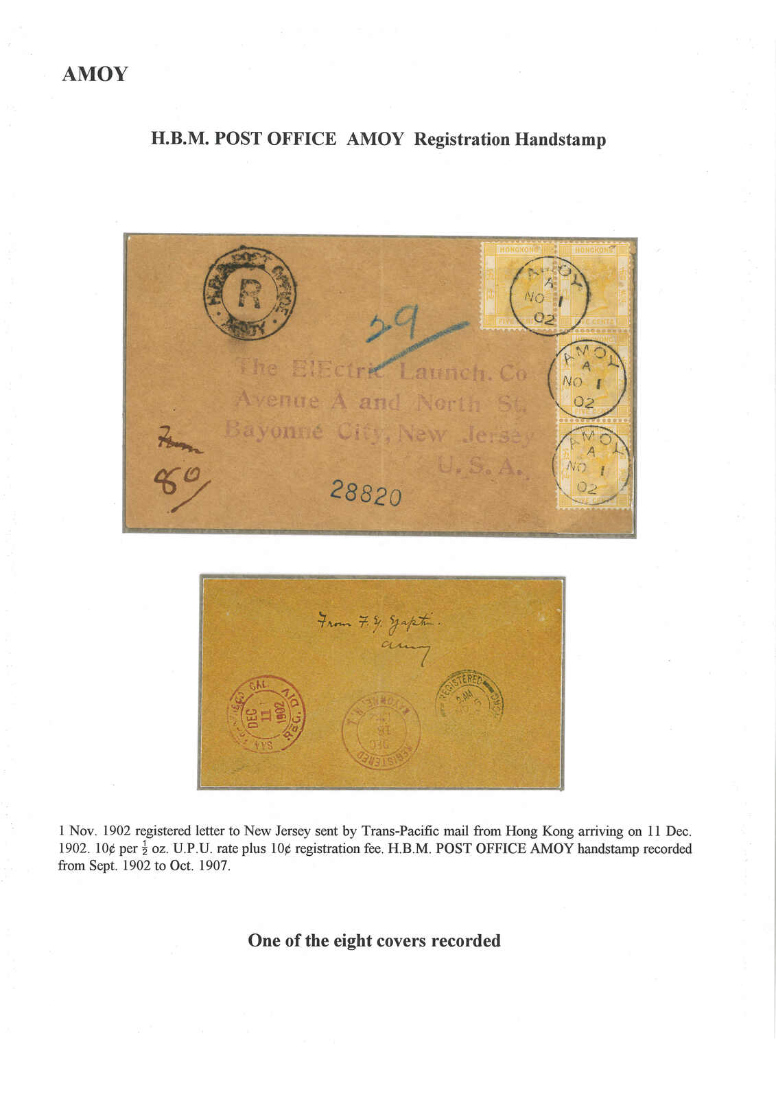 1902 Amoy (1 Nov) to USA, f.w. Hong Kong QV 5c x4 for 20c registered rate, tied by Amoy BPO cds., alongside with scarce Webb type Riii “HBM POST OFFICE / R / AMOY” R mark. Transit Hong Kong (6 Nov). Arrived Bayonne (18 Dec).