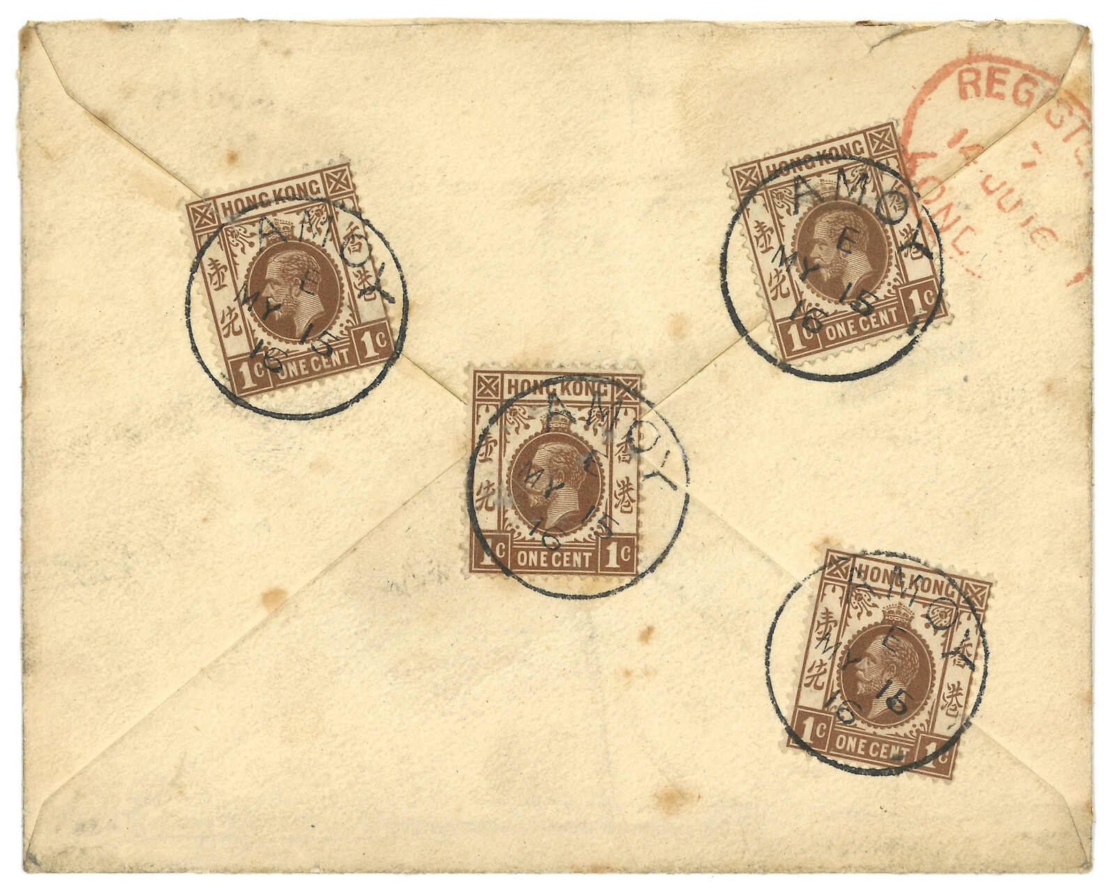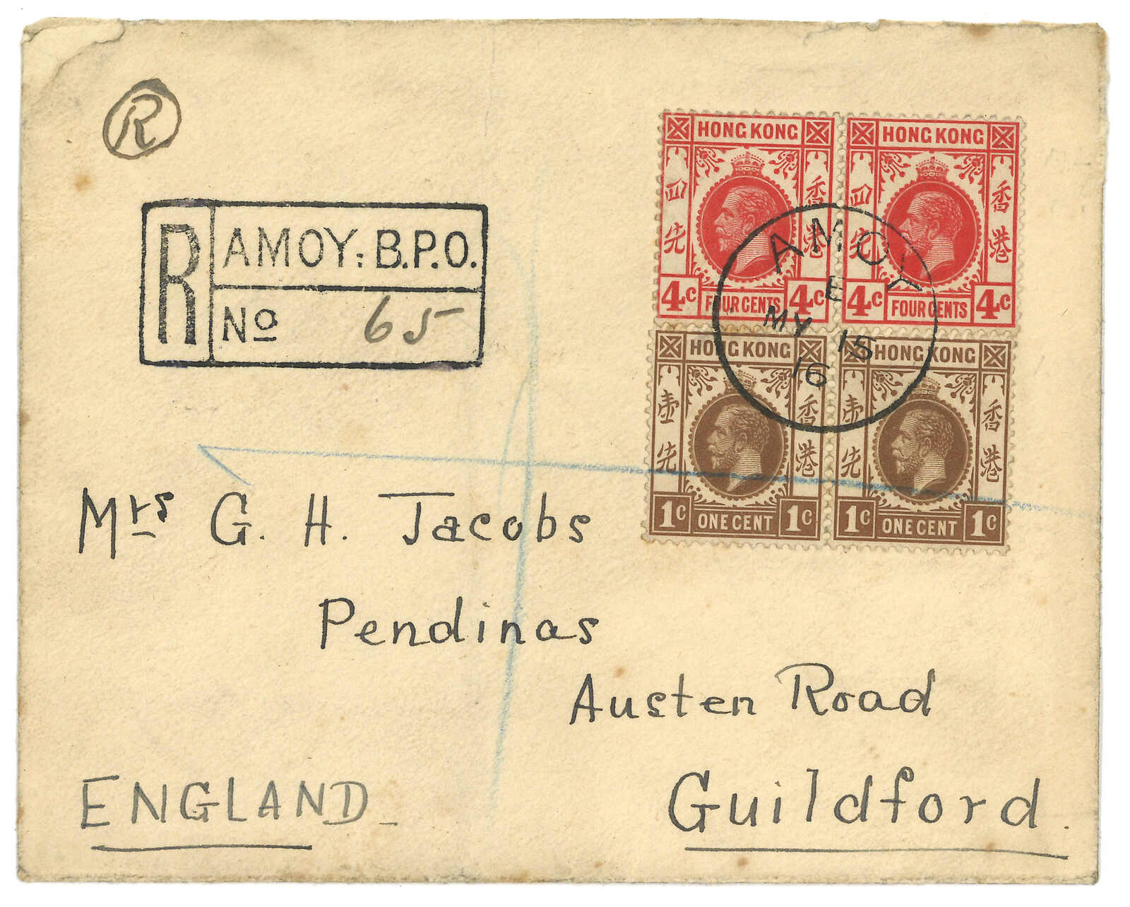 1916 Amoy (15 May) to England. Registered cover, f.w. Hong Kong KGV 1c in pair + 4c in pair on front and 1c single x5 on reverse, tied by Amoy BPO type Jii (index E) cds., alongside with type Riv registered mark. Arrived London
