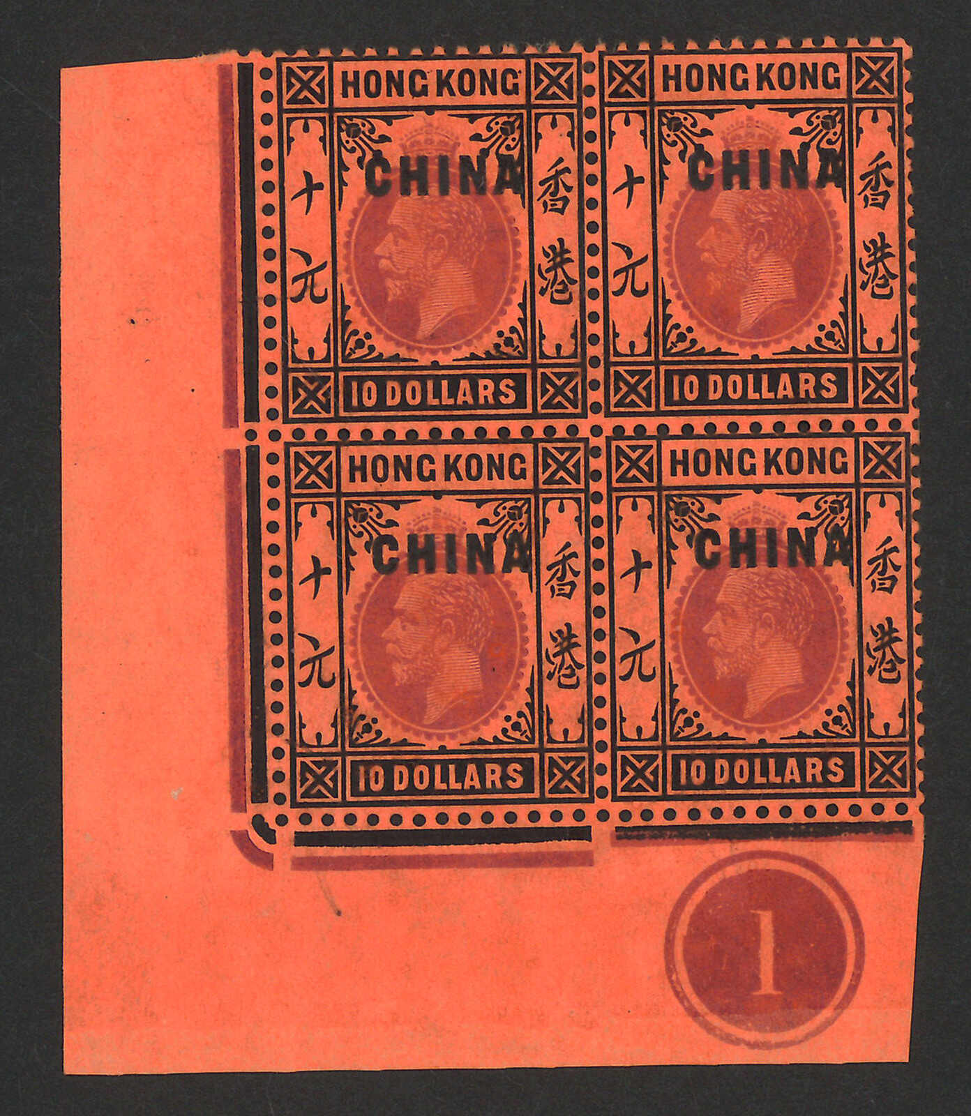 1917至1921年香港佐治五世加蓋CHINA第一組複正CA水印10元四方連新,帶左下直角邊及版號1(楊目BP16),輕貼上品。(Image 1)
