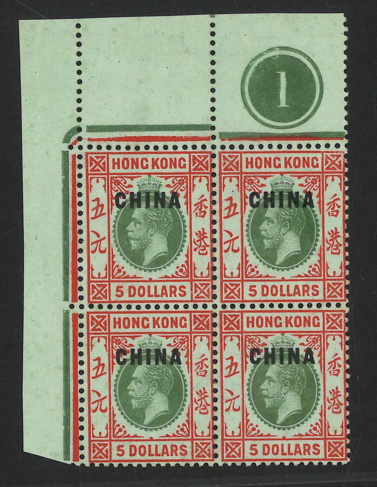 1917至1921年香港佐治五世加蓋CHINA第一組複正CA水印5元四方連新,帶左上直角邊及版號1(楊目BP15),原膠無貼。(Image 1)