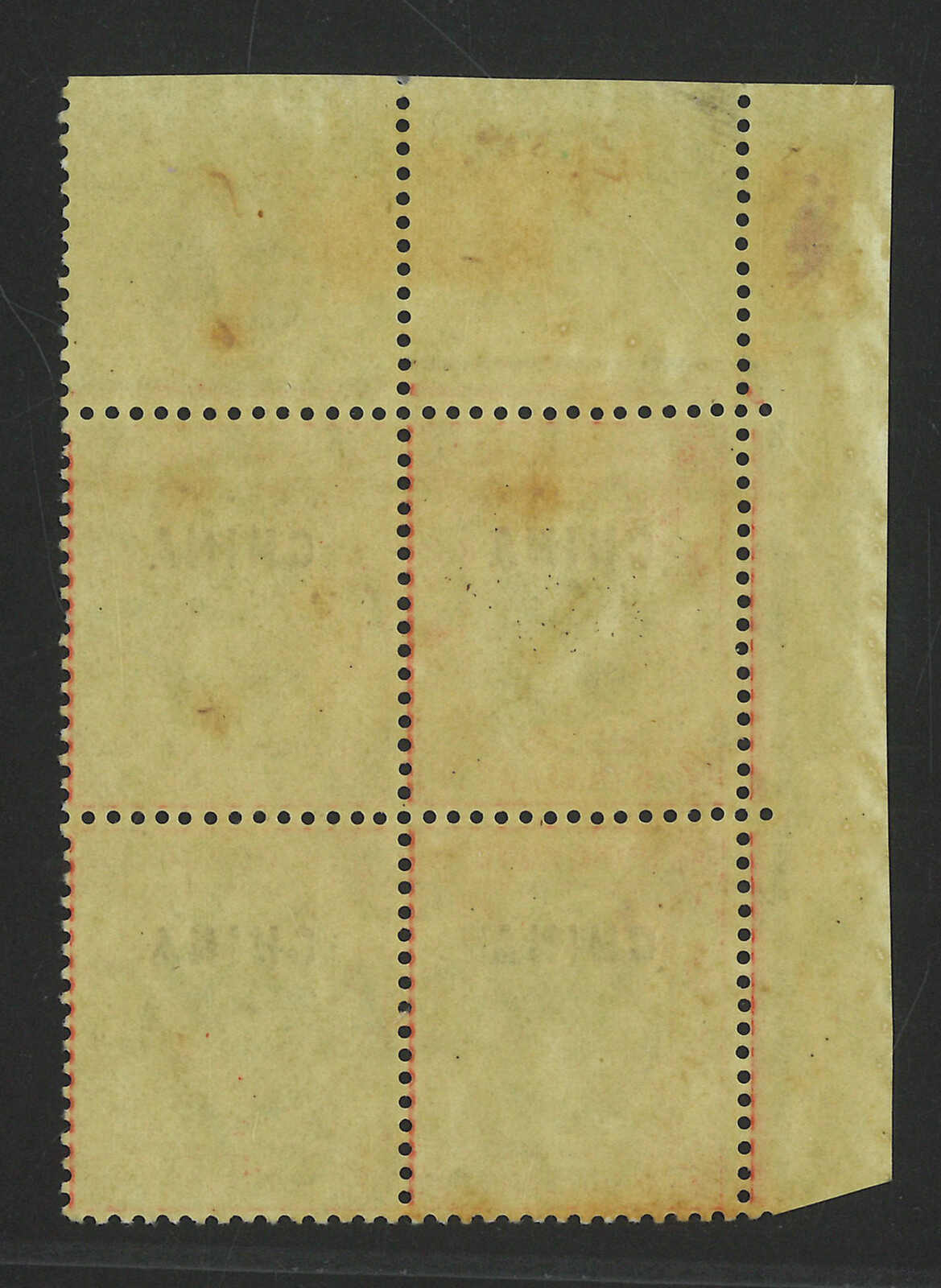 1917至1921年香港佐治五世加蓋CHINA第一組複正CA水印1仙九方連新,中央一枚爛皇冠變異(楊目BP1b),輕貼。(Image 1)