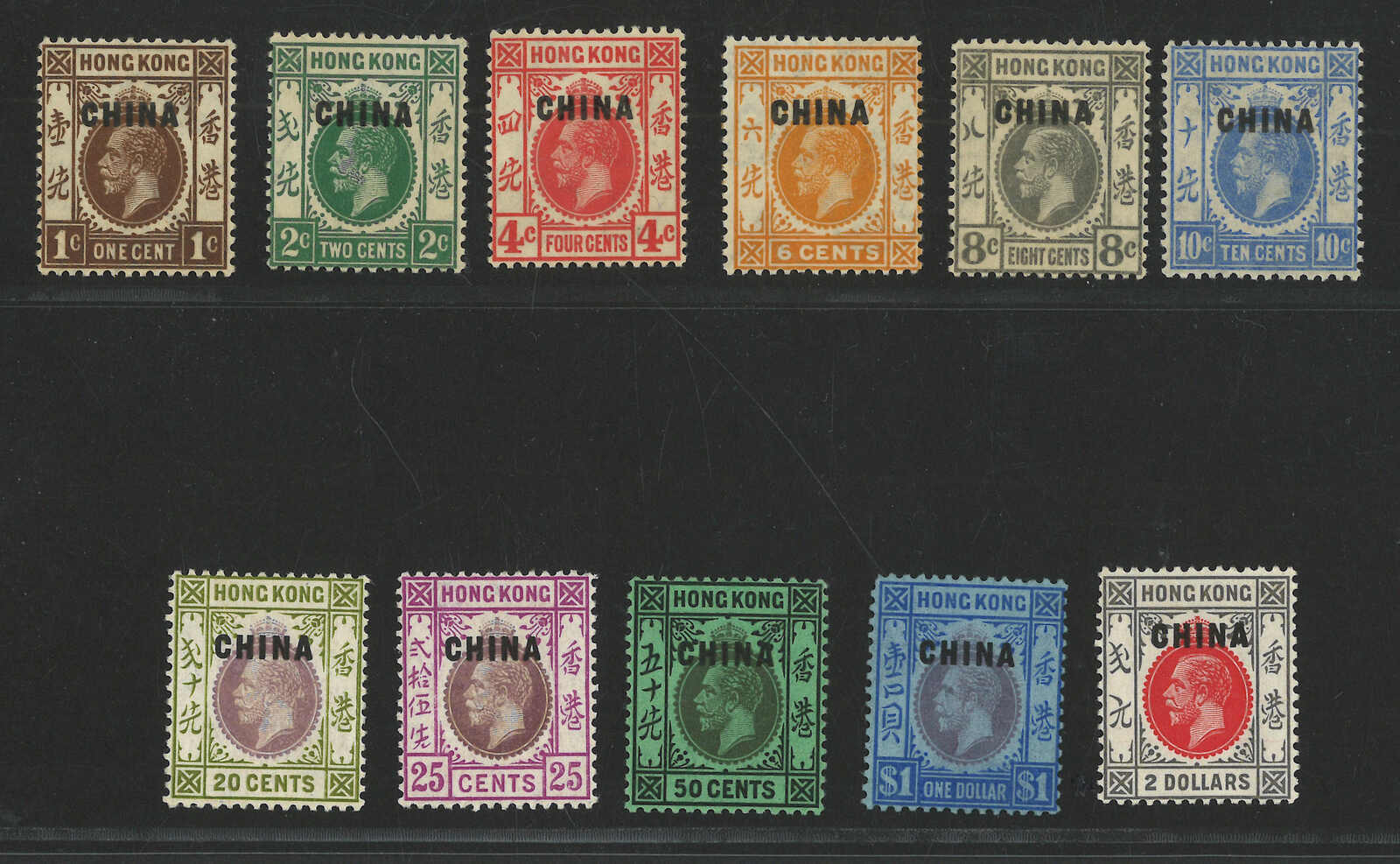 1922-1927 Hong Kong KGV ovpt. CHINA 2nd issue wmk multiple scrpt CA multiple set of 10, denominations from 1c to $1, all with plate number 1 (Yang BP17-26), MH. A nice group.