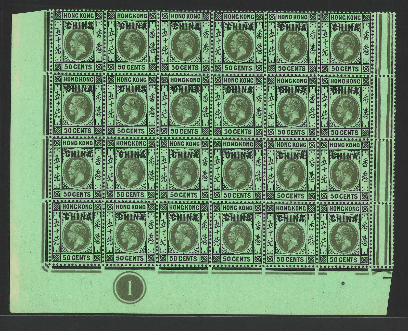 1912-1921 Hong Kong KGV ovpt. CHINA 1st issue wmk multiple crown CA 50c in block of 24 with bottom left corner margin and plate number 1 (Yang BP11). MNH.