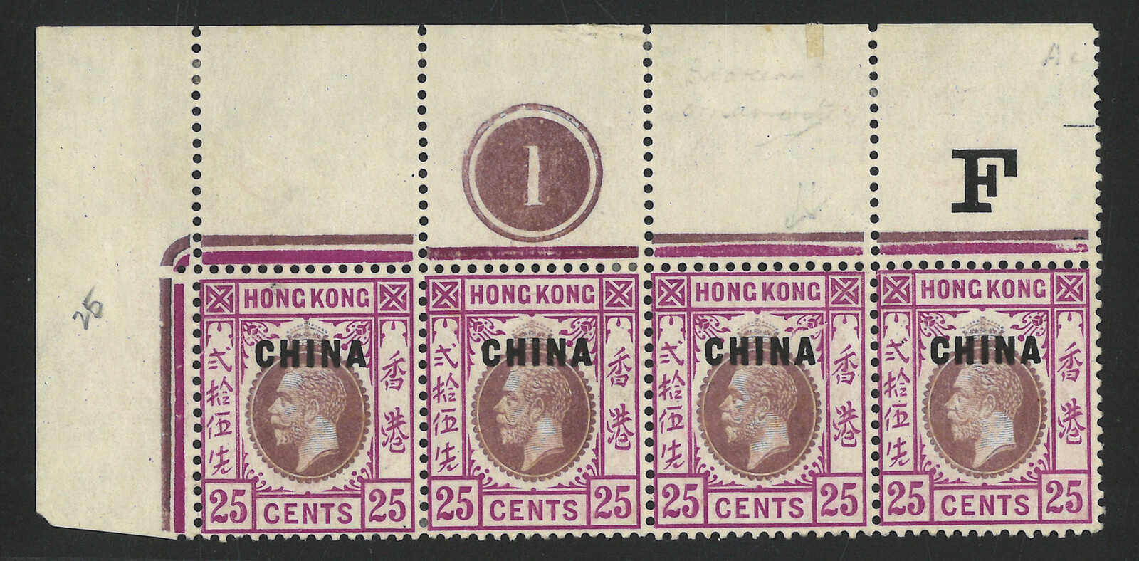 1922至1927年香港佐治五世加蓋CHINA第二組複草CA水印25仙橫四連新,當中一枚帶爛花變異,付貨代號F(楊目BP24),背貼。Webb指爛花變異在加蓋CHINA票上十分少見。(Image 1)