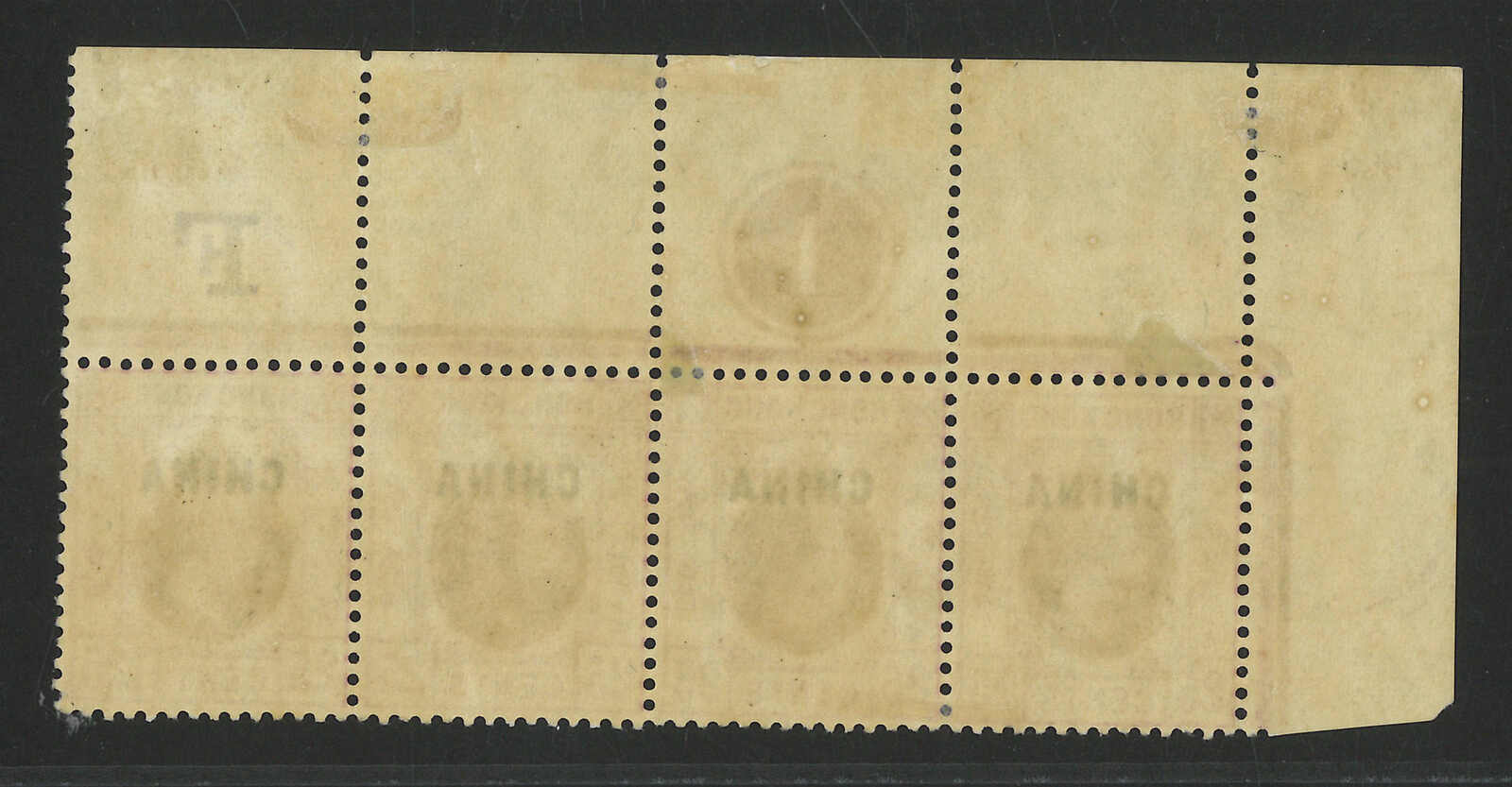 1917-1921 Hong Kong ovpt. CHINA 1st issue wmk multiple crown CA $5 in block of 4 (Yang BP15) with top rigth corner margin and plate number 1. MNH with original gum.