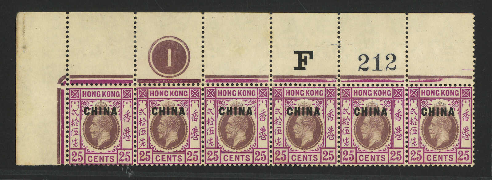 1922至1927年香港佐治五世加蓋CHINA第二組複草CA水印25仙橫六連新,當中一枚帶爛花變異,付貨代號F212(楊目BP24),背貼。Webb指爛花變異在加蓋CHINA票上十分少見。(Image 1)