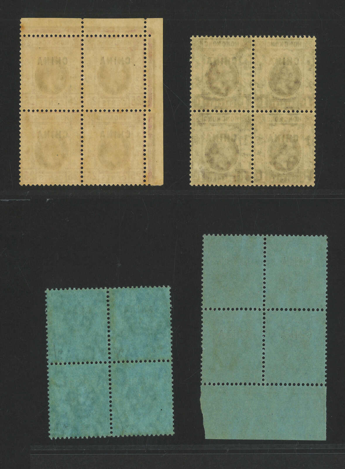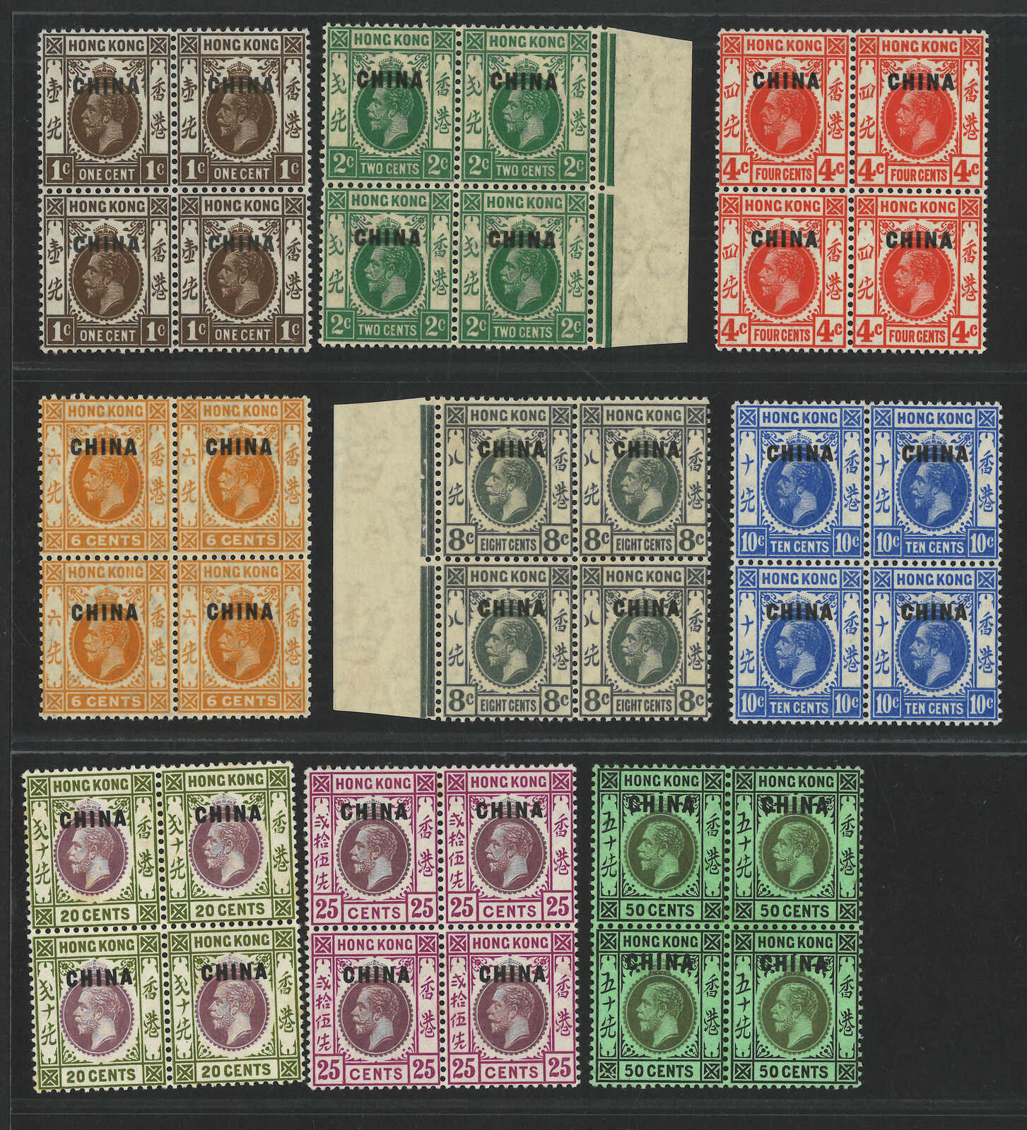1917-1921 Hong Kong KGV ovpt. CHINA 1st issue wmk multiple crown CA block of 4 set, denominations inclde 1c, 2c, 4c, 6c, 8c, 10c, 20c, 25c and 50c. MNH.