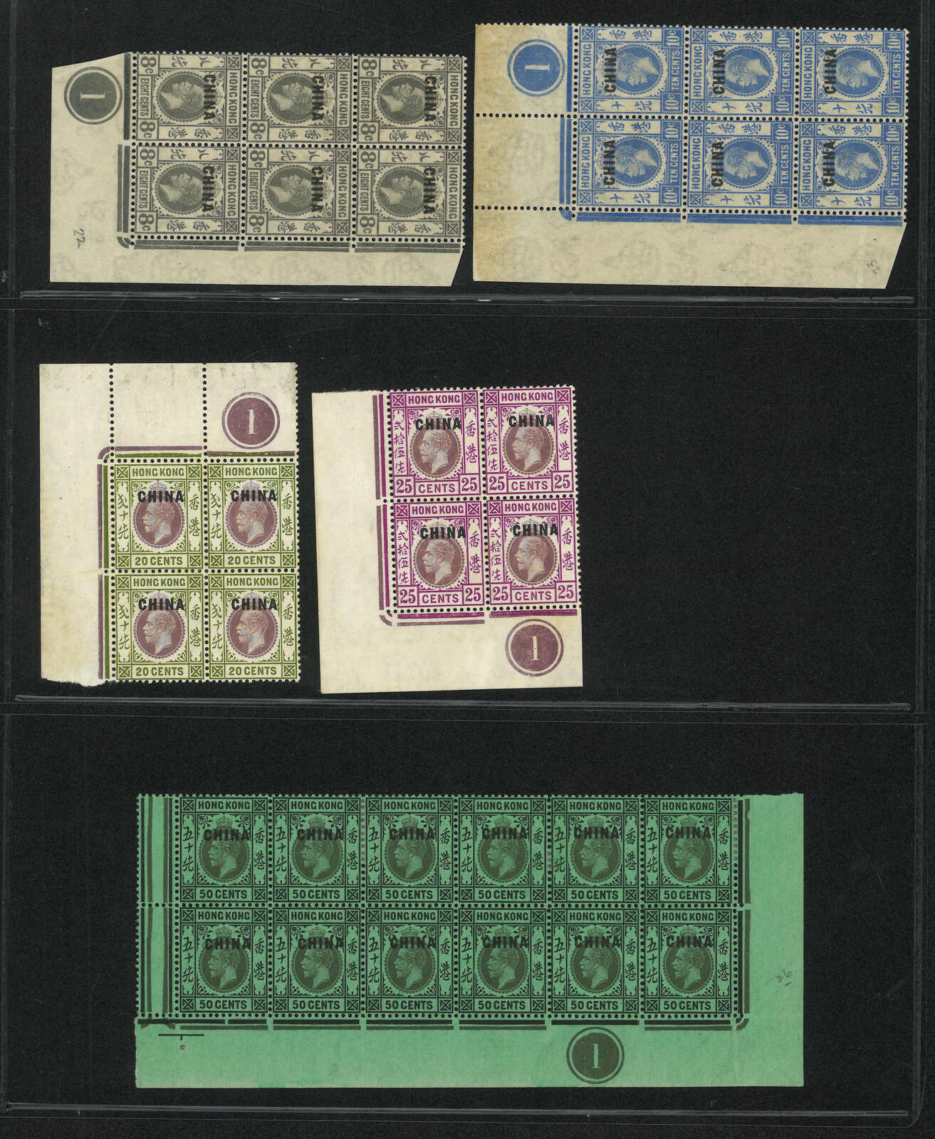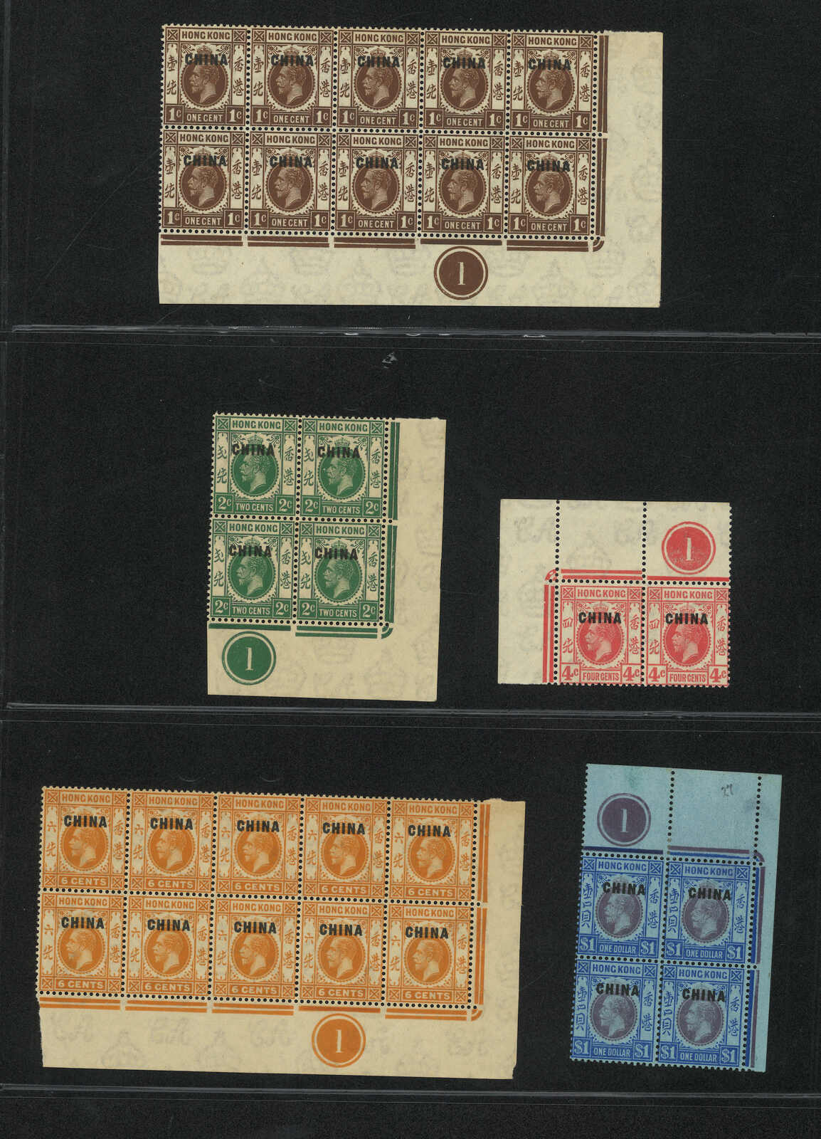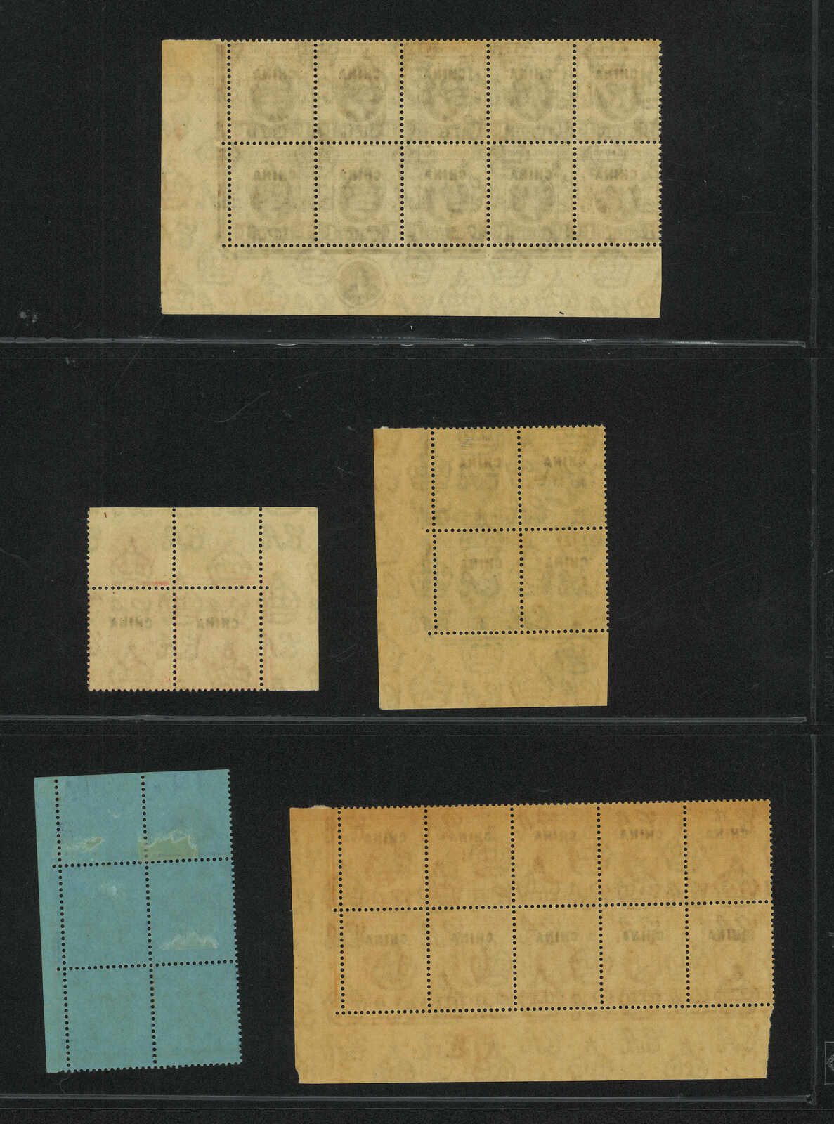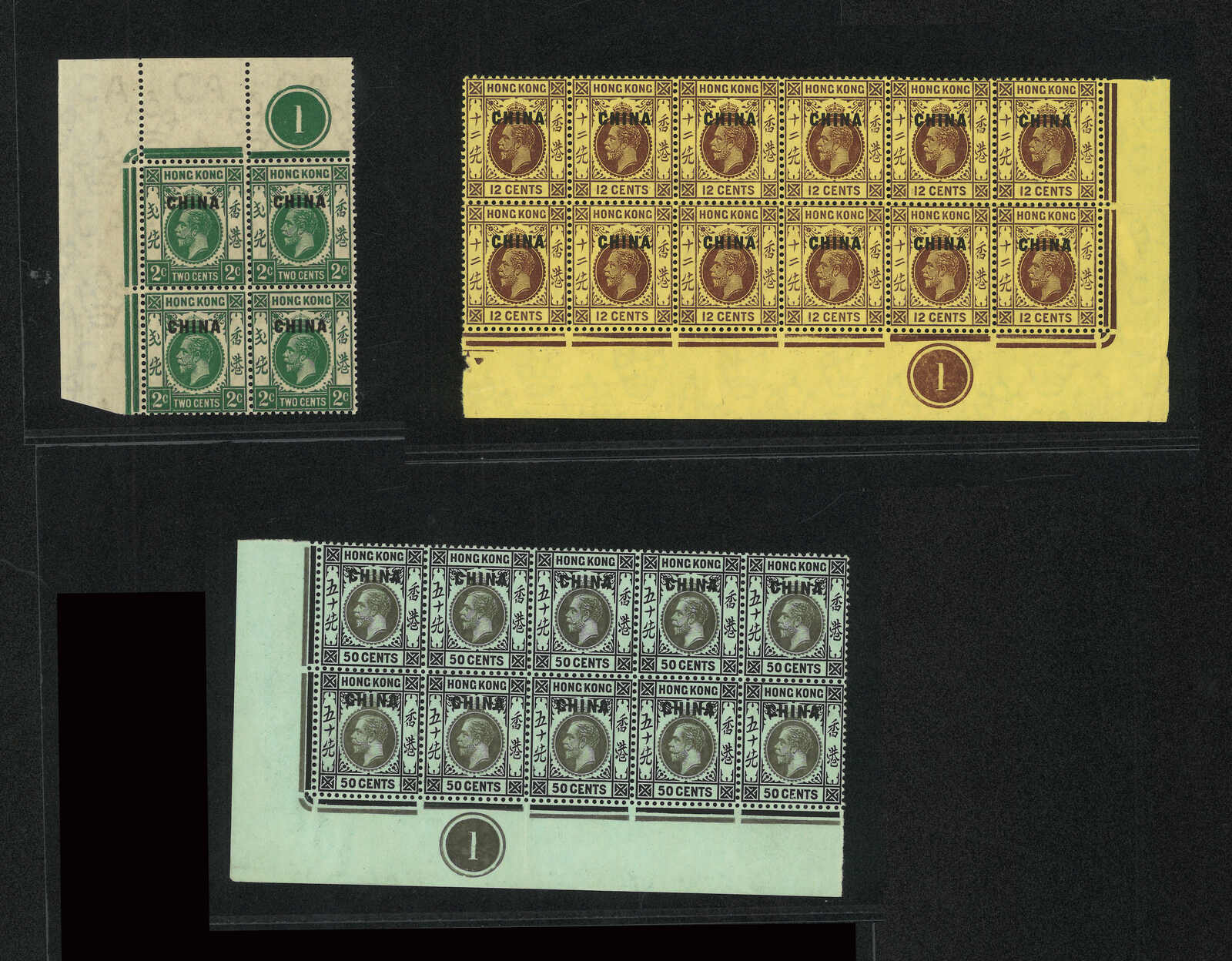 1917-1921 Hong Kong KGV ovpt. CHINA 1st issue wmk multiple crown CA 2c, 12c and 50c in multiples, all with plate number 1. MLH/MNH.