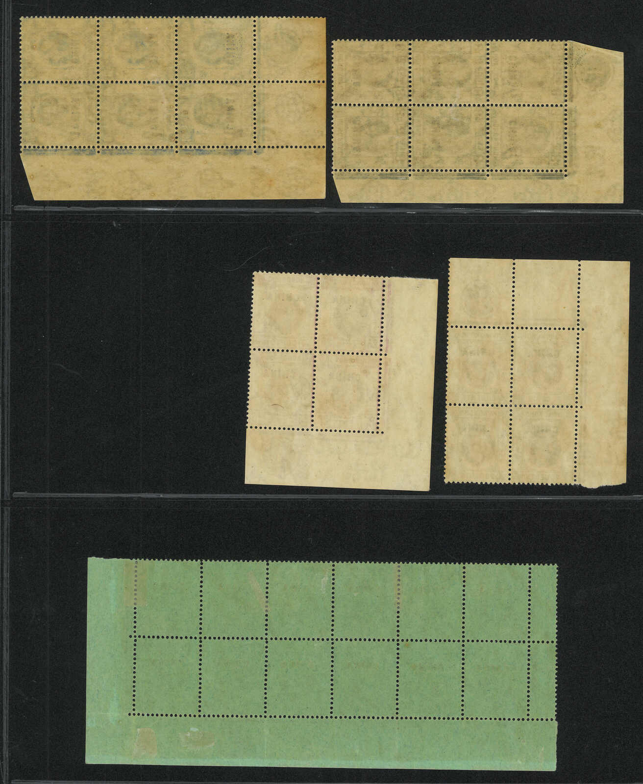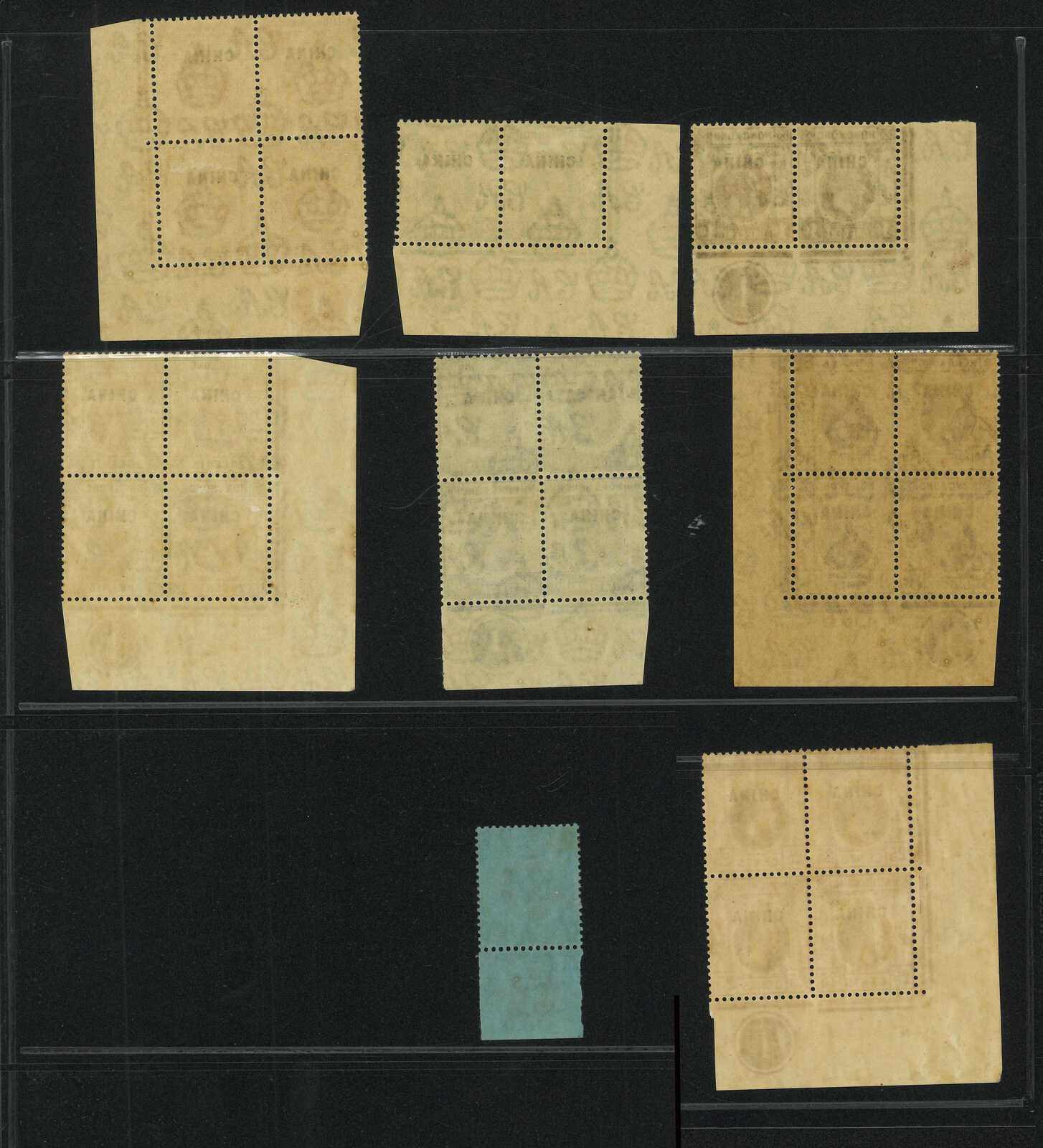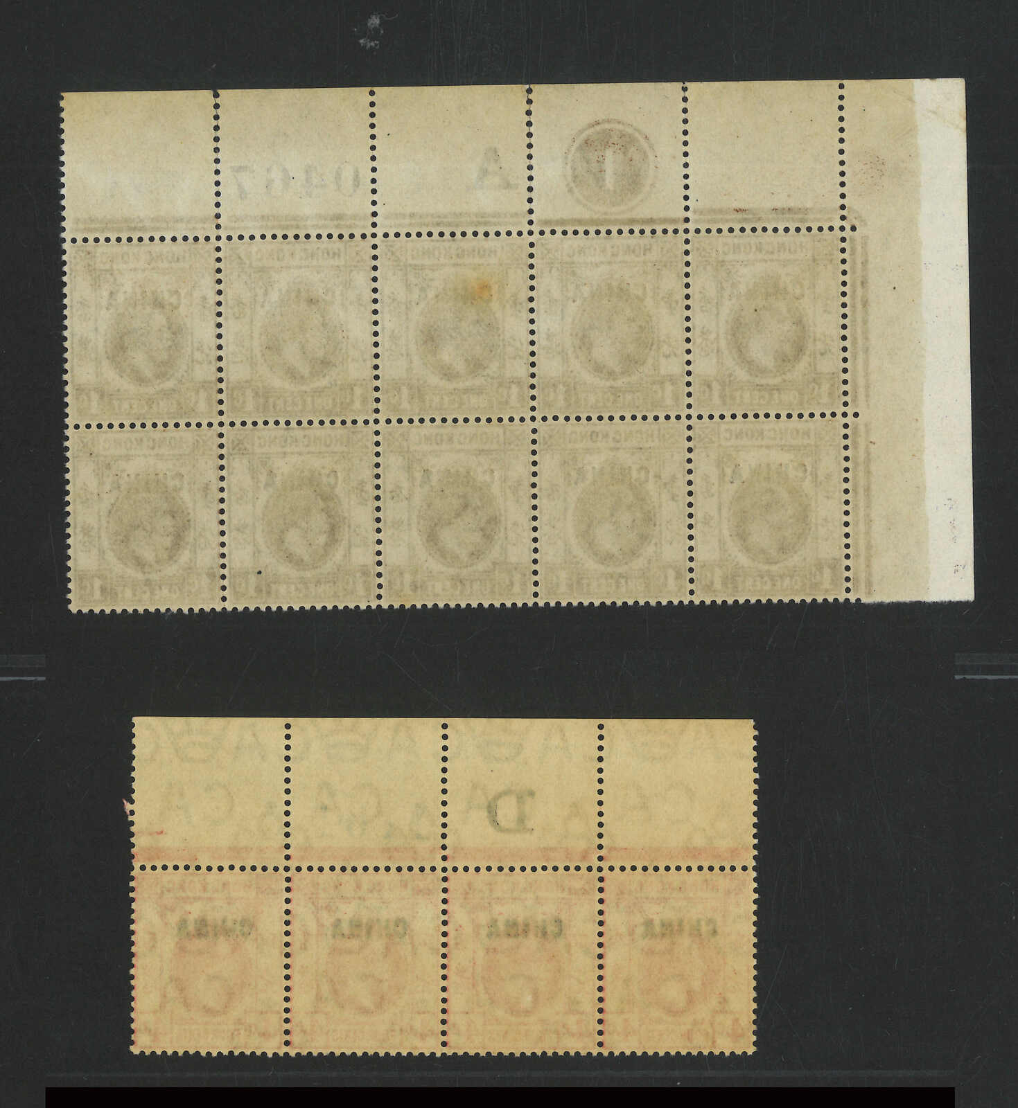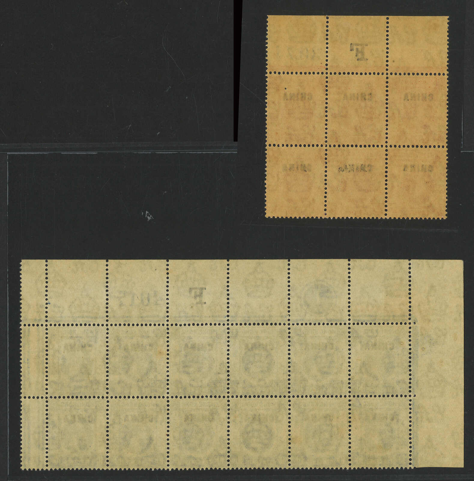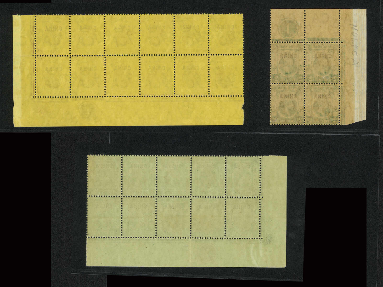 1917-1921 Hong Kong KGV ovpt. CHINA 1st issue wmk multiple crown CA 2c, 12c and 50c in multiples, all with plate number 1. MLH/MNH.