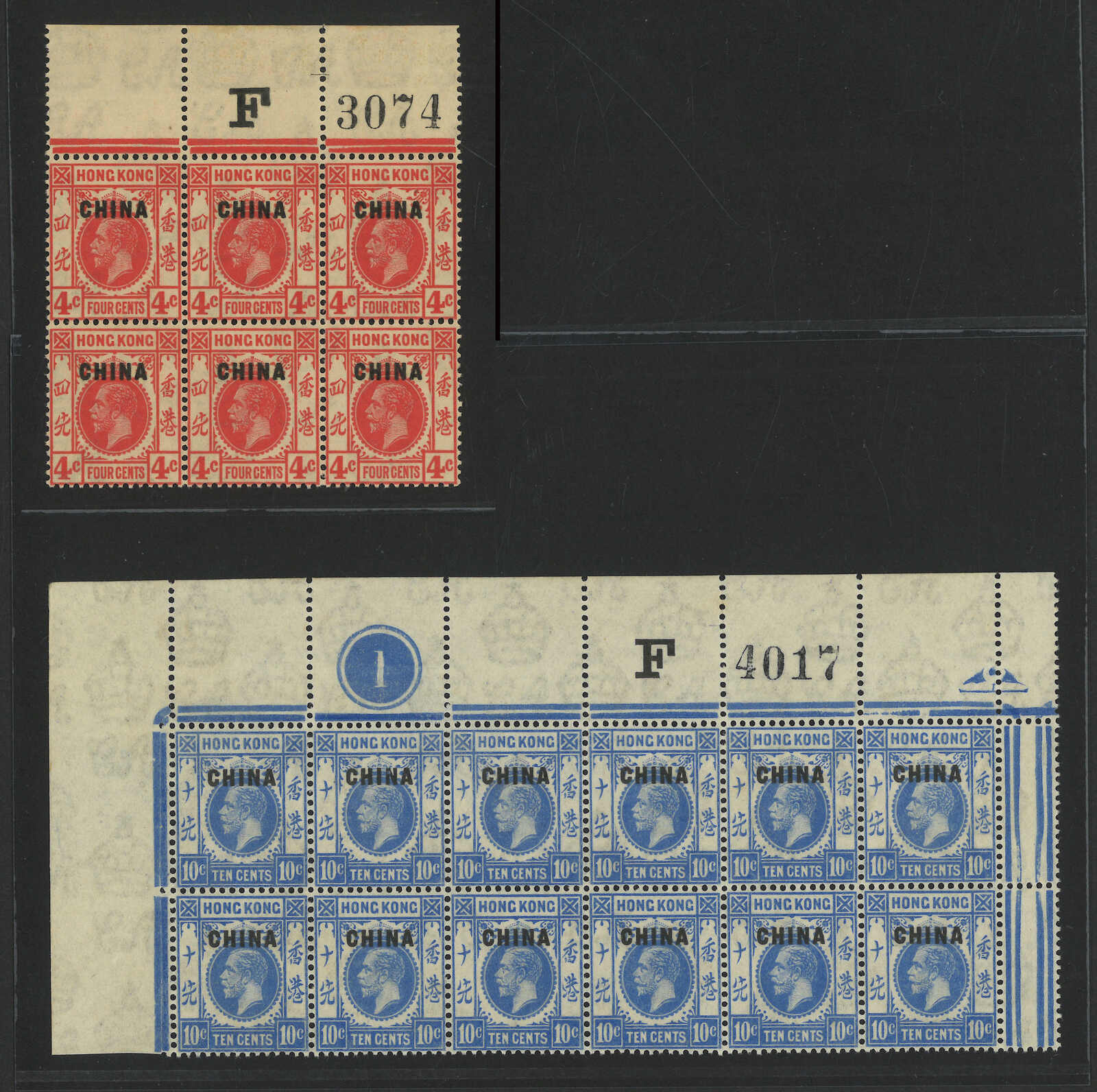 1922-1927 Hong Kong KGV ovpt. CHINA 2nd issue wmk multiple script CA 4c and 10c in multiple, both with requisition letter F and number (Yang BP19, BP22), MNH.