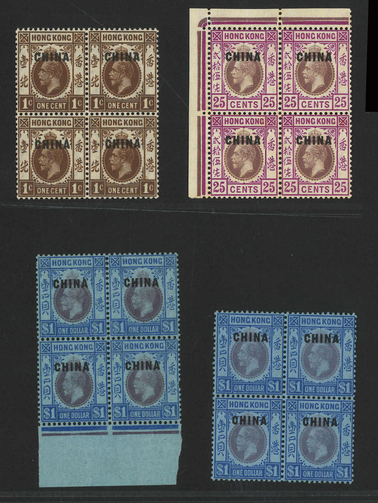 1917至1927年香港佐治五世加蓋CHINA 1仙、25仙及1元四方連新,共四件,無貼/輕貼。(Image 1)
