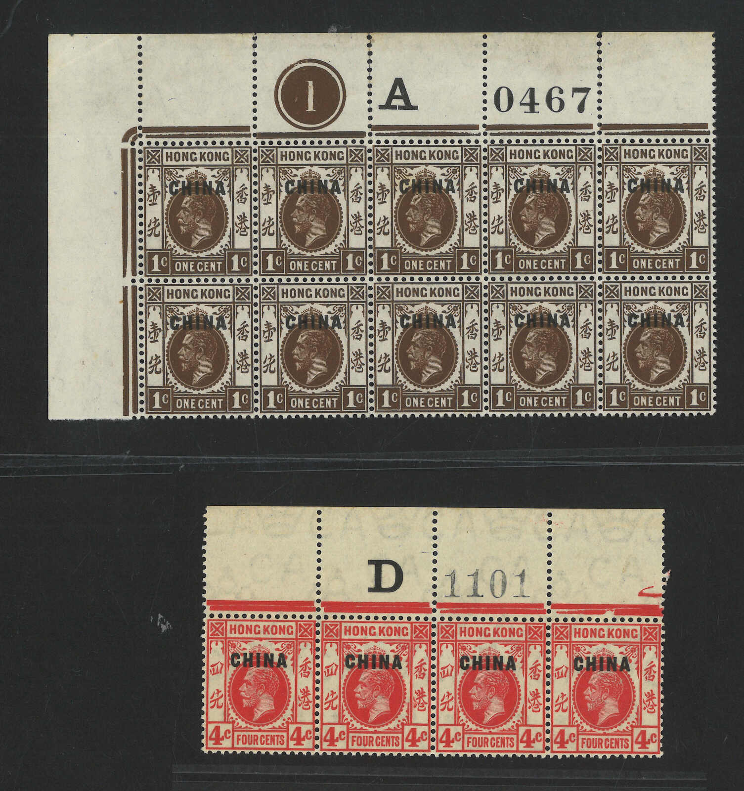 1917-1921 Hong Kong KGV ovpt. CHINA 1c and 4c in multiples, with requisition number A0467 and D1101 respectively (Yang BP1, BP3), MLH.