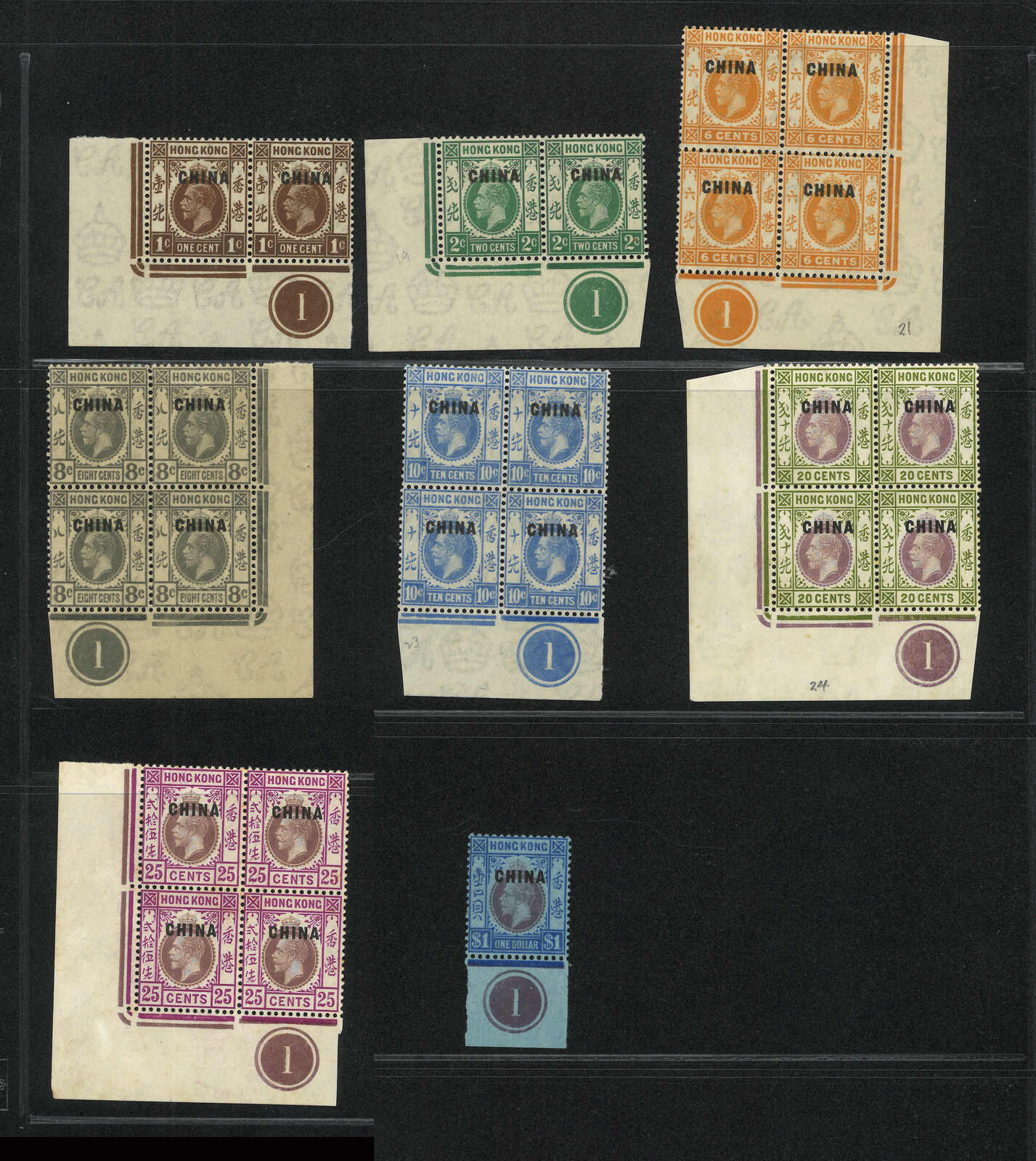 1922-1927 Hong Kong KGV ovpt. CHINA 2nd issue wmk multiple scrpt CA set of 8 denominations from 1c to $1, all with plate number 1 All in mutliple except $1. MH. A nice group.